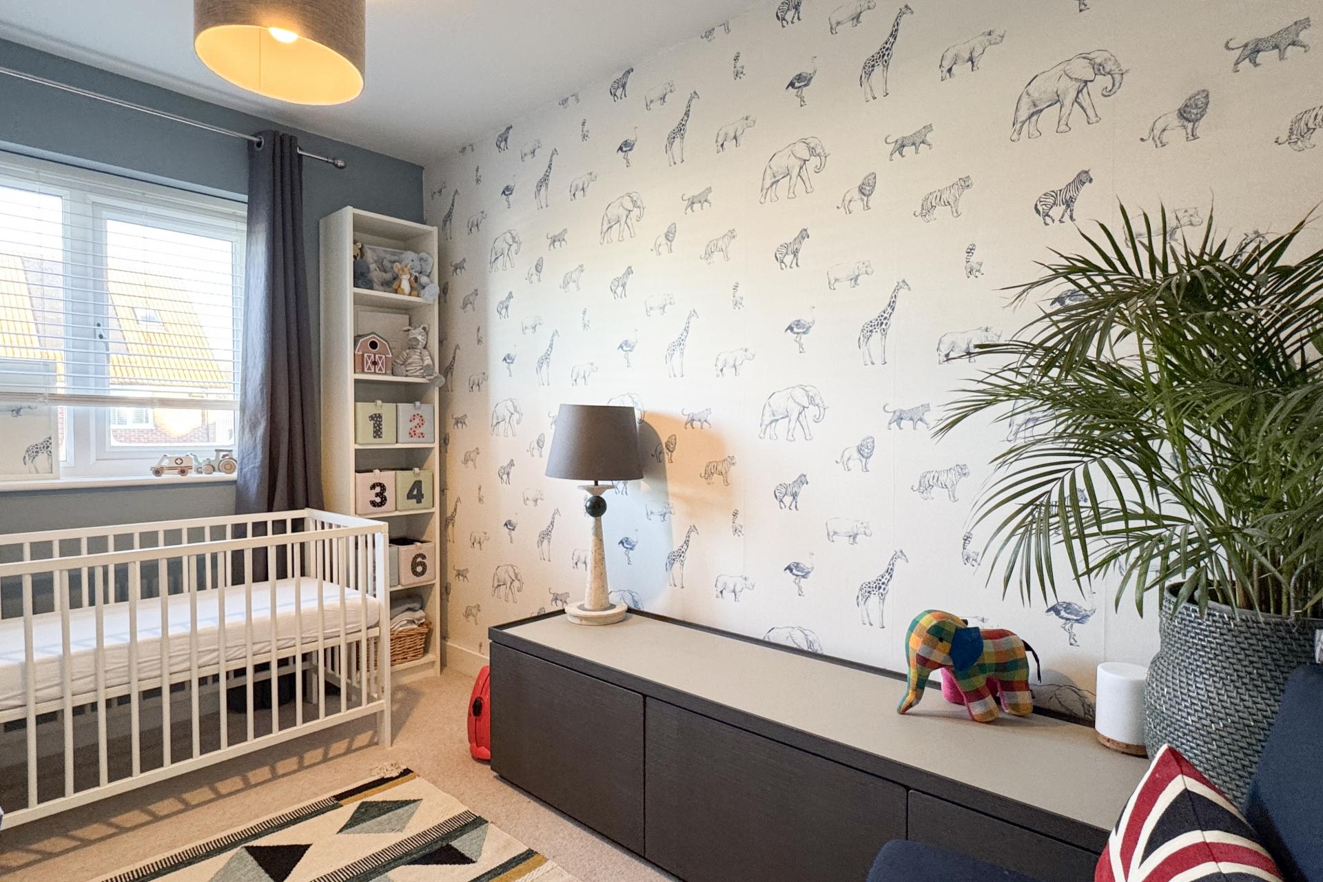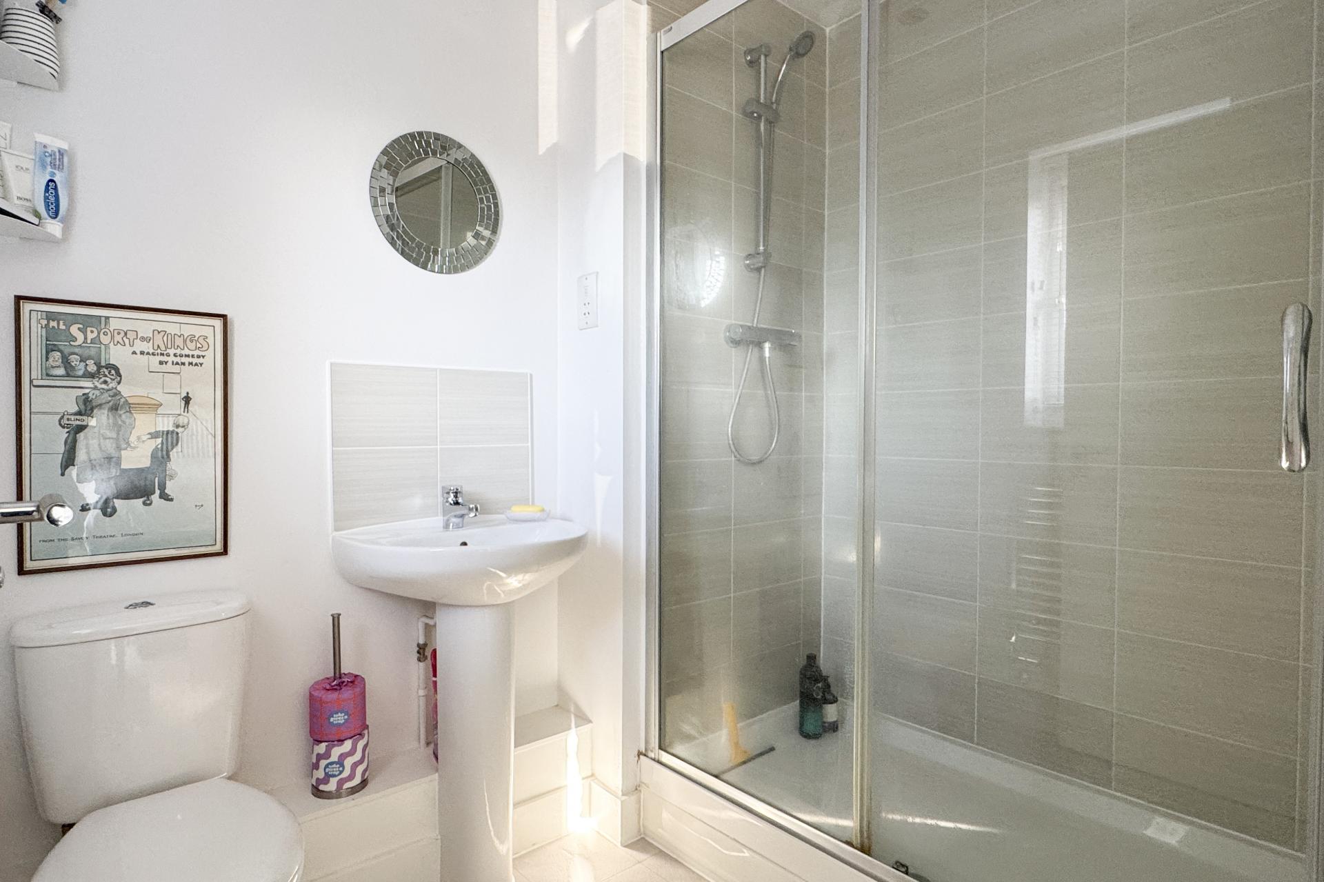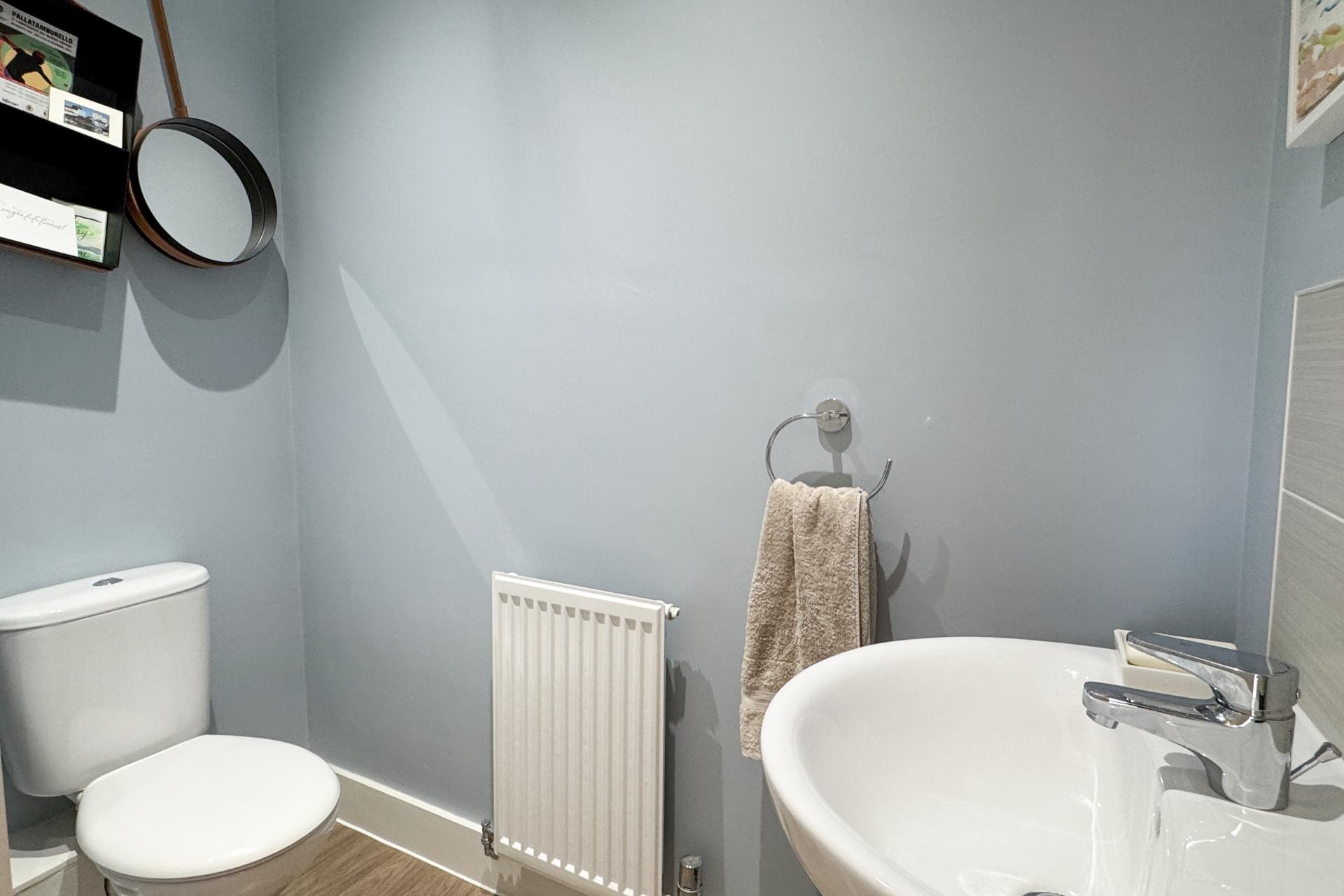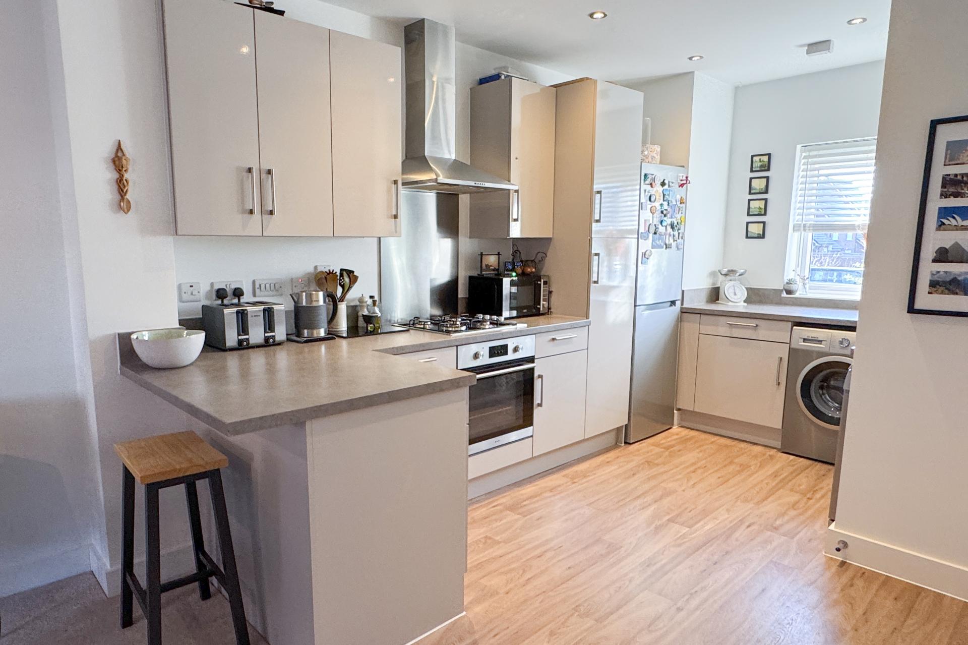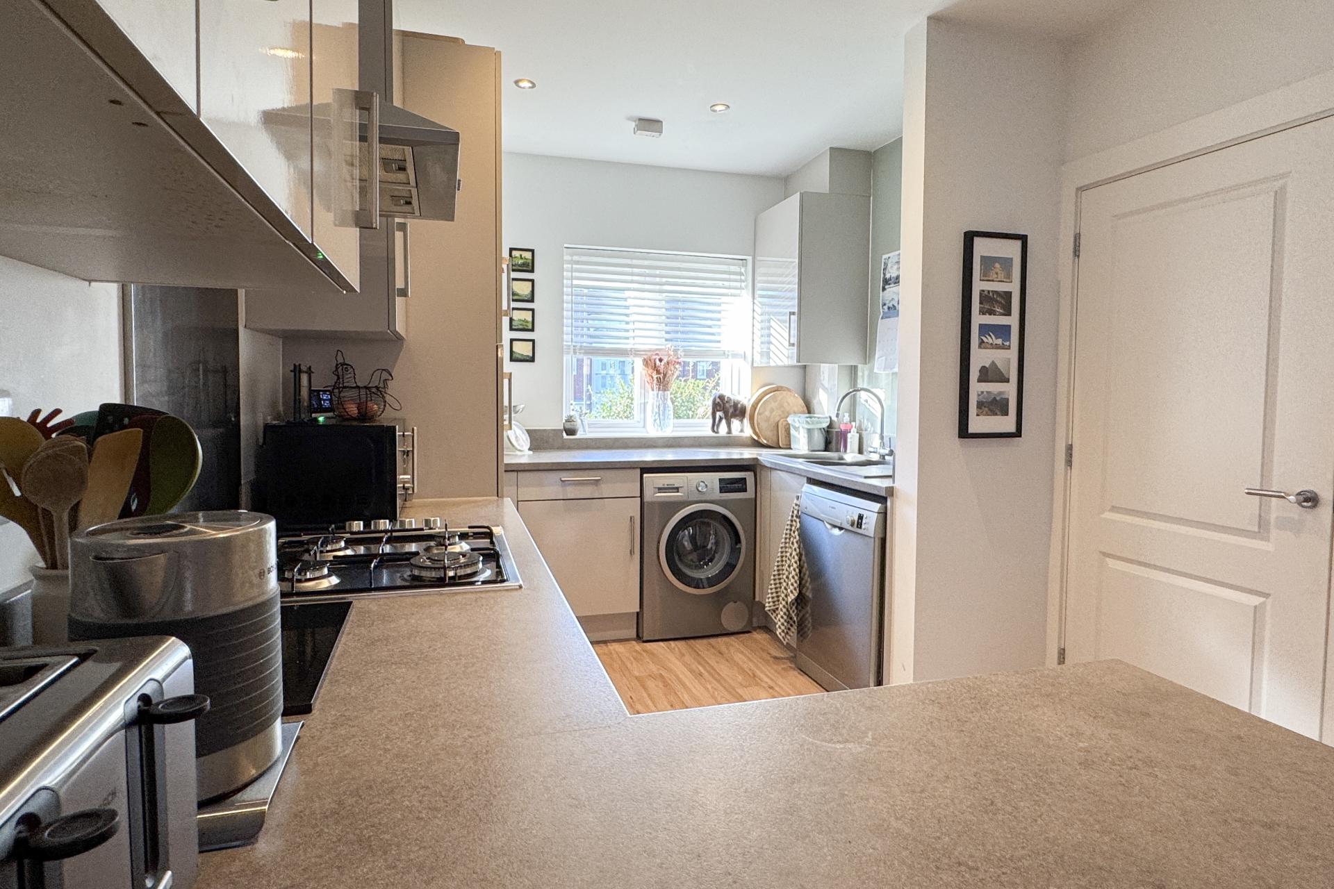 Upon entering, you are greeted by a spacious entrance hall that provides ample room for coats and shoes. The open-plan kitchen is a standout, with stylish floor and wall units. It offers plenty of space for essential appliances, including a washing machine, dishwasher, and fridge-freezer, as well as an integrated gas hob, oven, and extractor fan. The kitchen flows seamlessly into the sitting room, a generous and welcoming space. Double doors lead out to the garden, while a large under-stairs storage cupboard ensures practicality. Completing this floor is a downstairs toilet, finished in neutral tones for a modern, stylish touch.