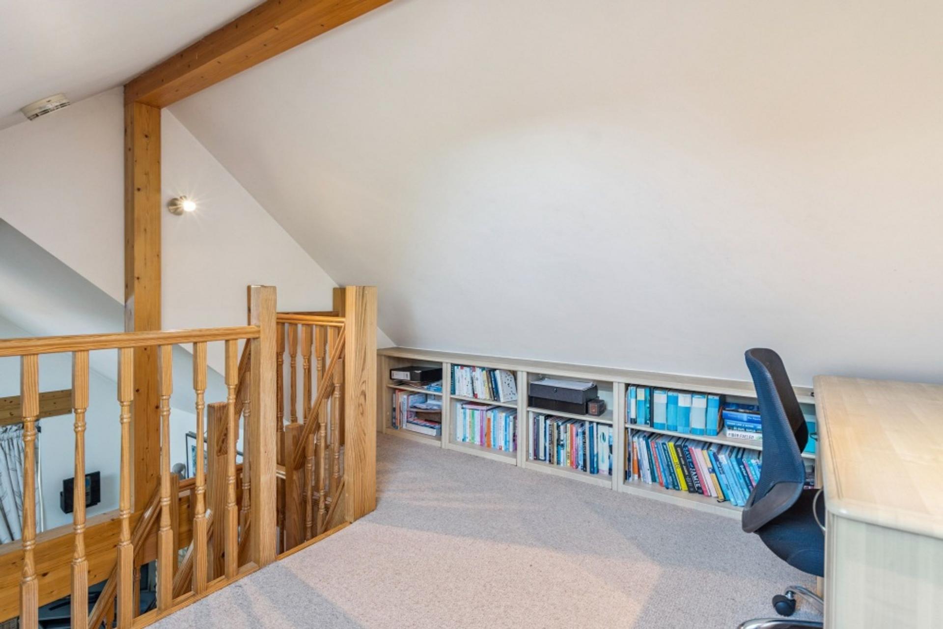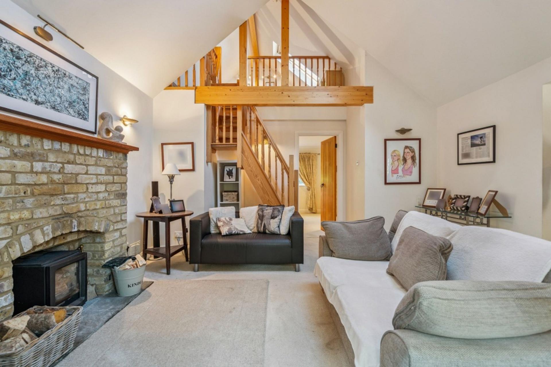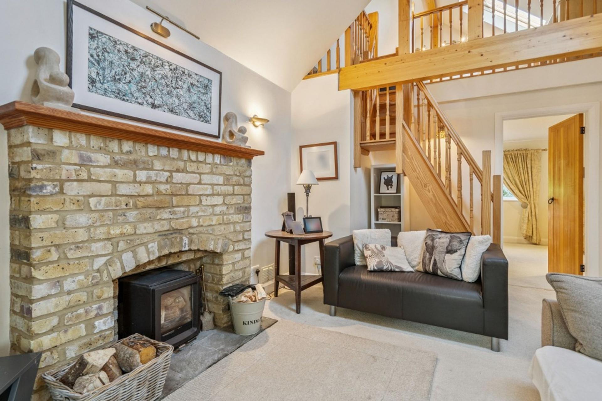 From the dining room is the stunning living room with vaulted ceiling, feature brick fireplace with log burner and slate hearth. This room also has direct access to the garden via double patio doors leading onto private, secluded patio, perfect for evening drinks. This room also benefits from a breathtaking mezzanine level, currently utilised as a study, which adds to the sense of space and grandeur.