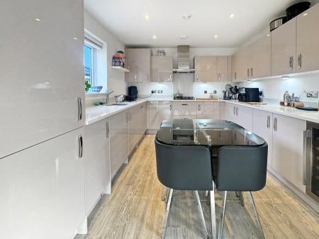 Continuing through the hallway, there is a convenient downstairs cloakroom before reaching the heart of the home an impressive open-plan kitchen, dining and family room. The kitchen is fitted with a range of floor and wall-mounted cupboards, finished with Corian worktops, and offers excellent space for family life and entertaining. Double casement doors provide direct access to the garden and patio area.
