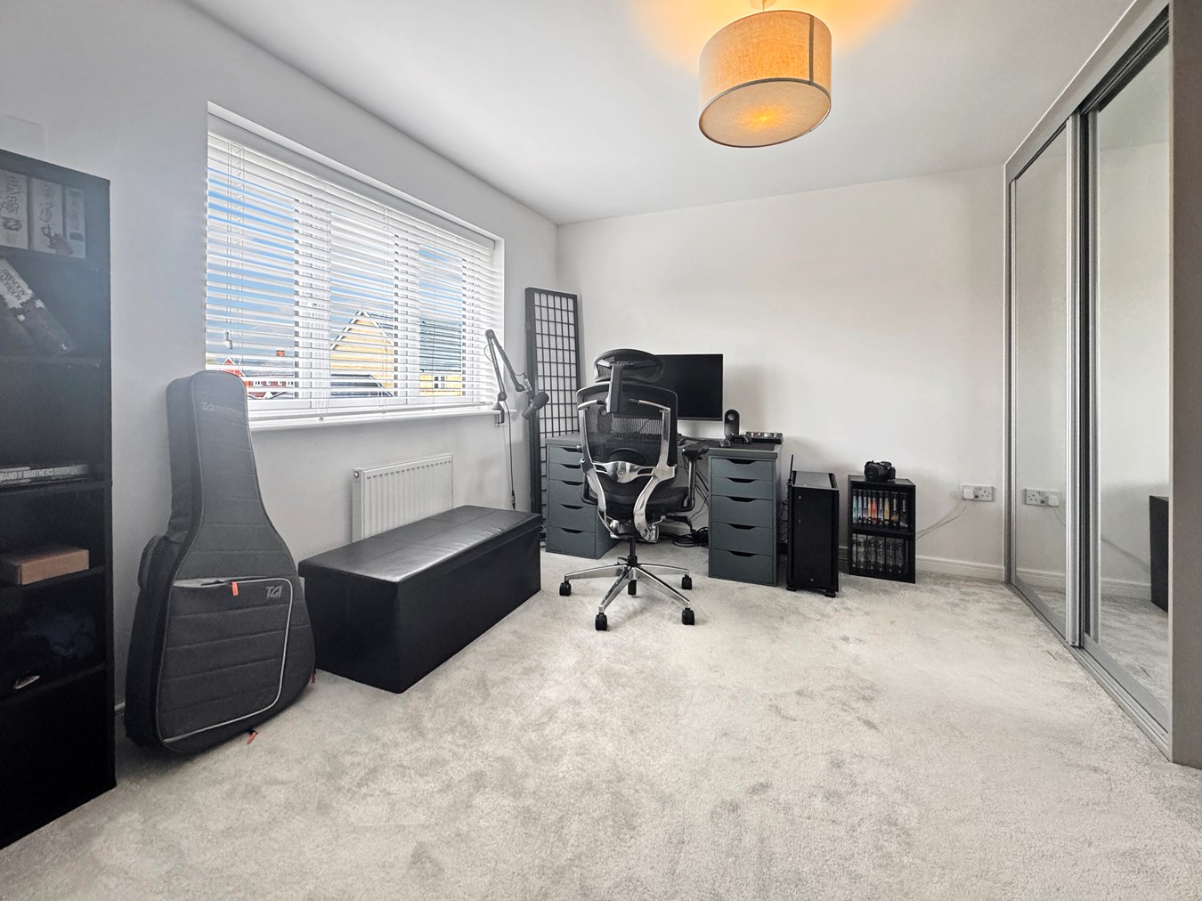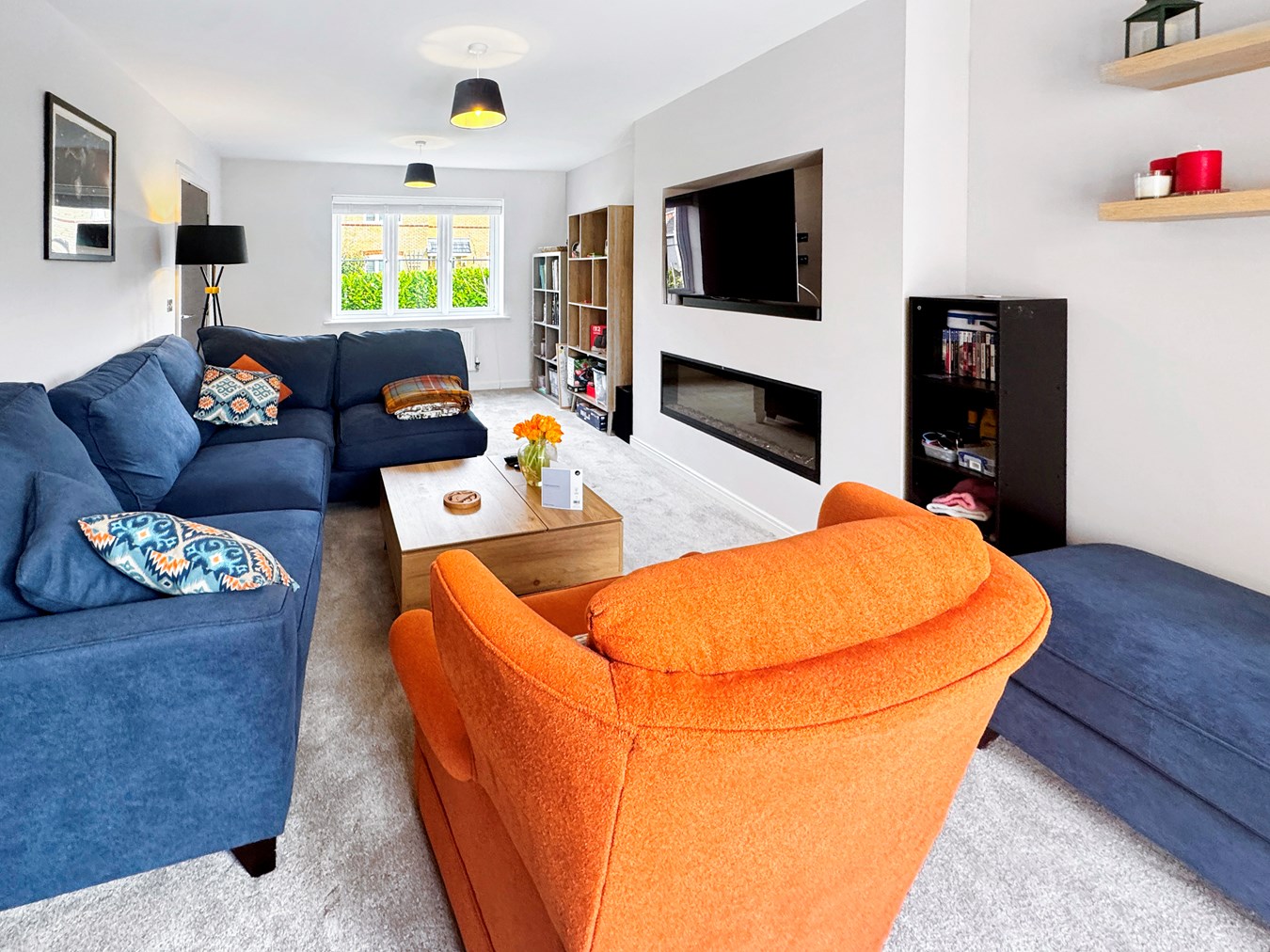 The property is entered via a welcoming entrance hall. To the left is a generous double-aspect living room, featuring an attractive fireplace and double doors opening onto the patio and rear garden, creating a bright and inviting space ideal for both relaxing and entertaining. To the right of the hallway is a well-proportioned study, perfect for home working.