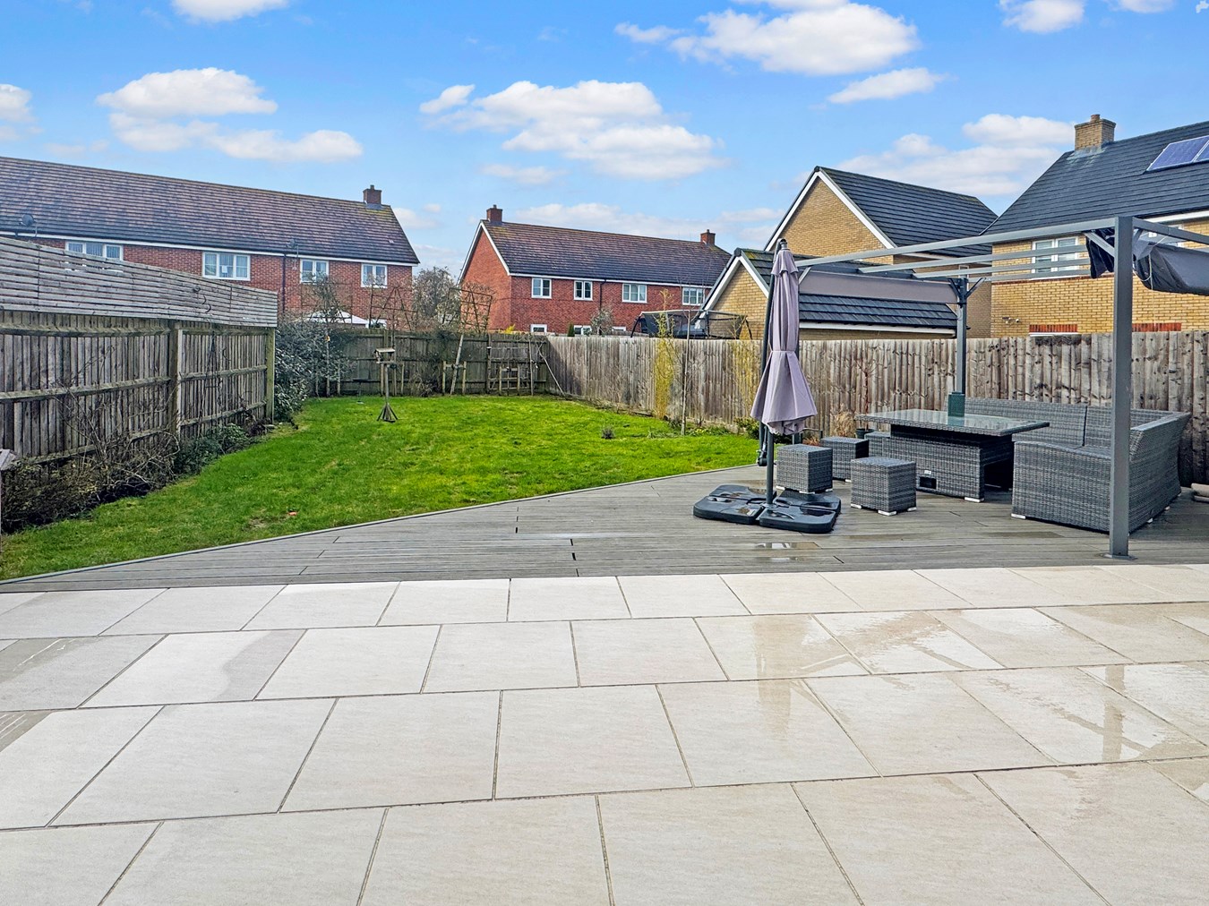 The rear garden is a particular feature, offering an extensive paved patio ideal for outdoor entertaining, complemented by decking and a well-maintained lawn. Well-established shrub borders provide colour and interest throughout the year, while panelled fencing offers a good degree of privacy.