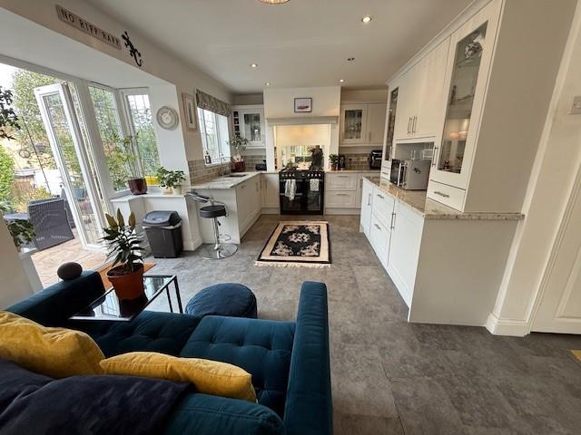 Dining Kitchen - 8.04 x 4.00 (26'4" x 13'1") - Wall and base units with Granite work surfaces, integral fridge / freezer, integral washing machine, gas range cooker with double extractor, 1.5 sink and drainer with chrome mixer tap, dining area, two French doors , LVT flooring, Upvc windows to rear and side elevations.