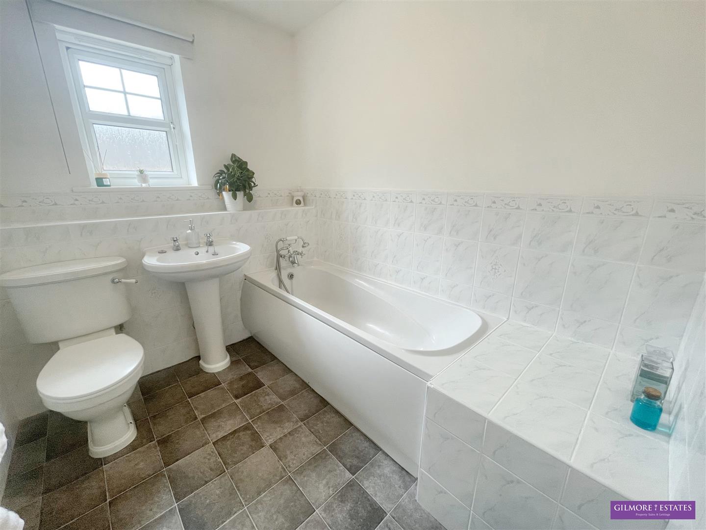 Bathroom - 2.48 x 1.98 (8'1" x 6'5") - White suite comprising of bath with chrome taps and shower attachment, WC, pedestal wash hand basin, 1/2 tiled walls, extractor fan, central heating radiator and Upvc window to front aspect.
