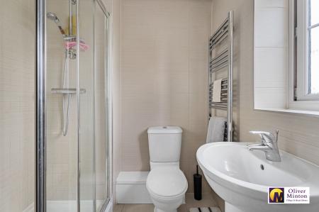 En-Suite Shower Room White suite comprising WC and pedestal wash hand basin. Shower cubicle. Extractor fan. Inset ceiling lights. Tiled walls and floor.