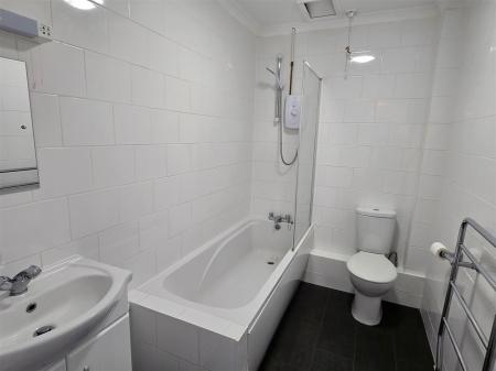 Modern white suite comprising bath with shower above and glazed shower screen, WC and wash hand basin with cupboards below. Heated towel rail.