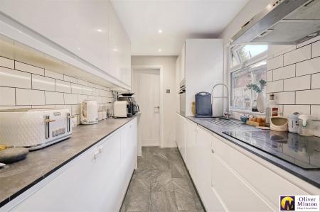Modern range of white wall, base and drawer units with slate work surfaces incorporating sink unit. Built-in electric induction hob with extractor hood above. Built-in electric oven. Integrated fridge and freezer and slimline dishwasher. Ceramic tiled floor. uPVC double glazed window.