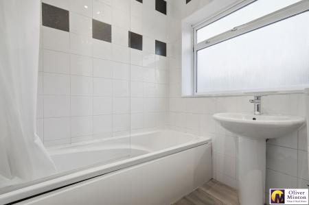 White suite comprising bath with shower attachment, low level flush WC and pedestal hand basin. Chrome heated towel rail. 2 double glazed obscure windows to rear. Part tiled walls. Inset ceiling lights.