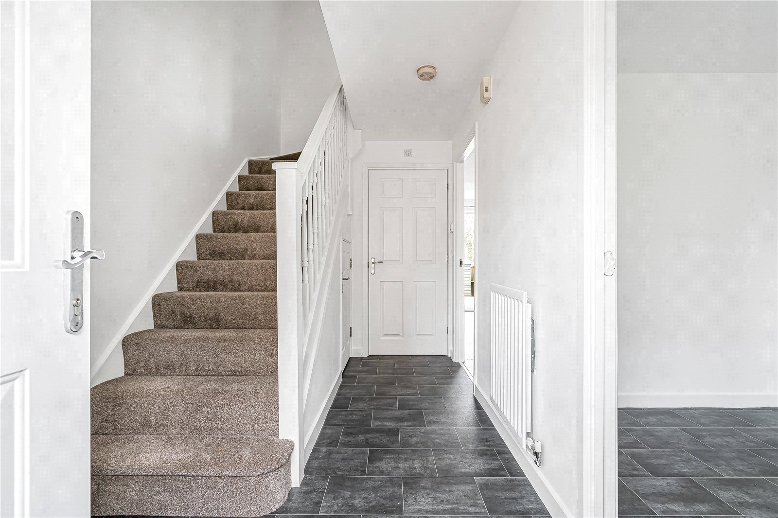 Reception Hall : Stairs to first floor, radiator, tile effect flooring and storage cupboard.