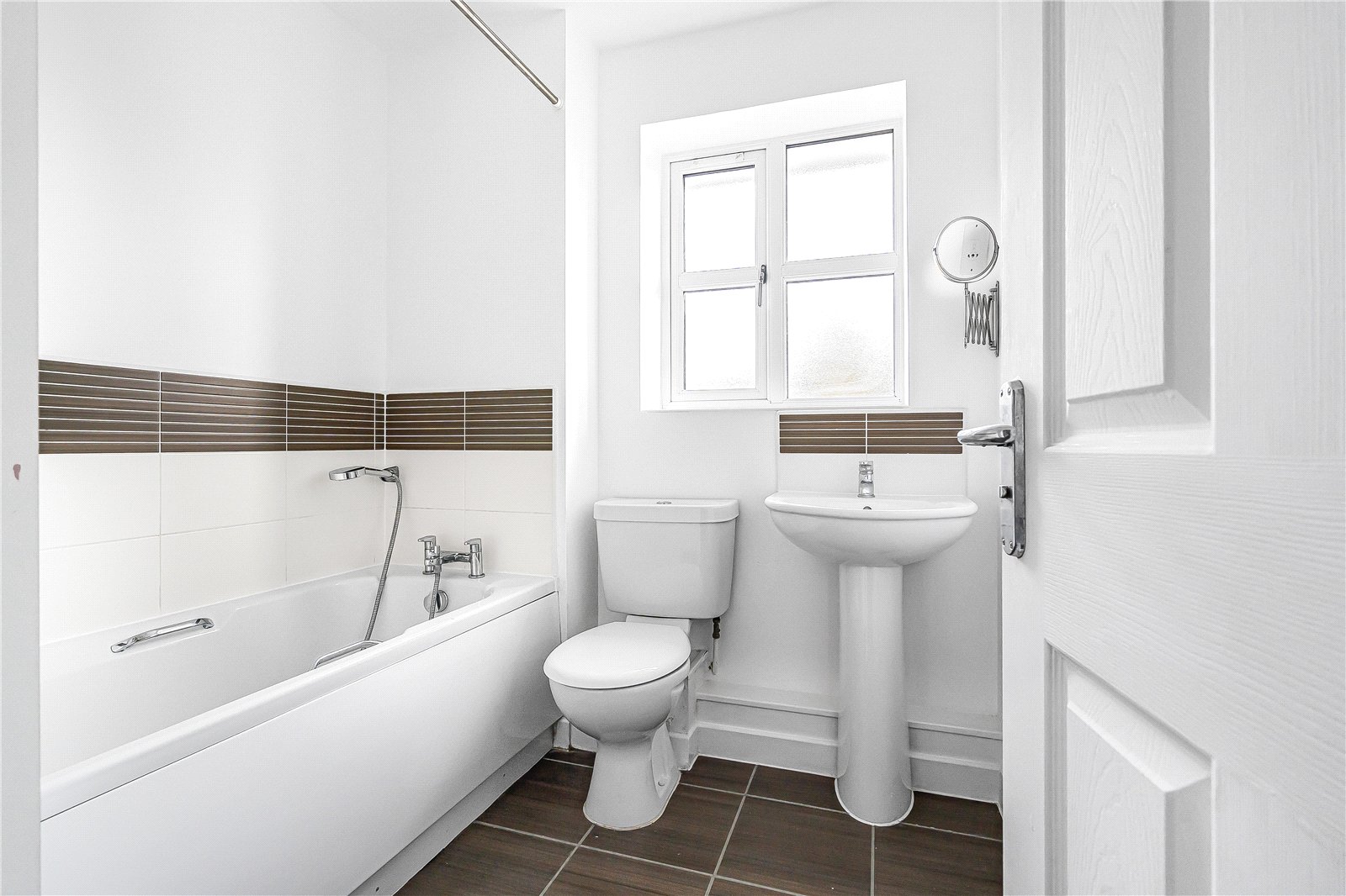 Bathroom : Comprising suite of bath with shower attachment, wash hand basin and WC. Radiator, tiled floor, radiator and light point.