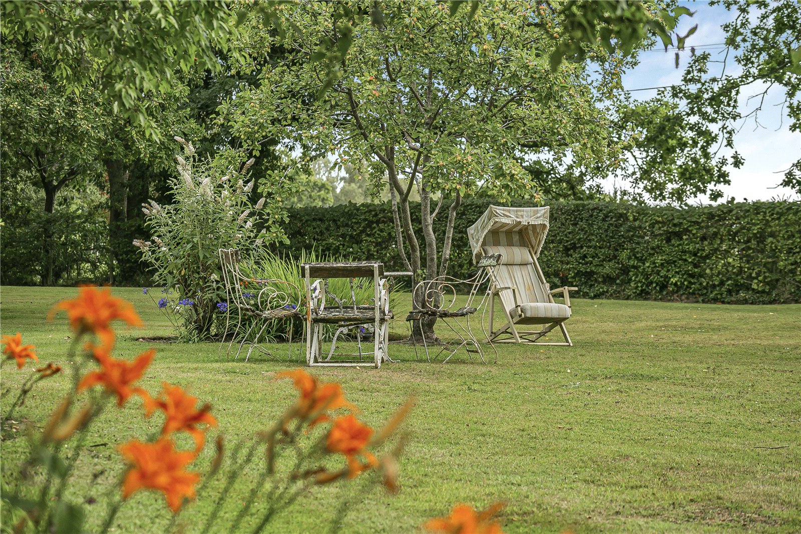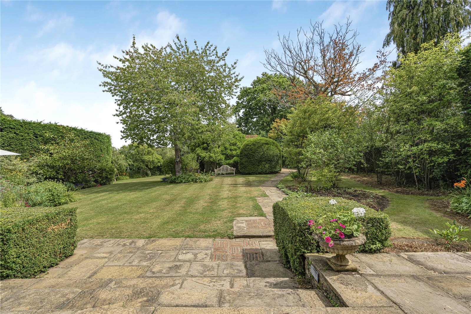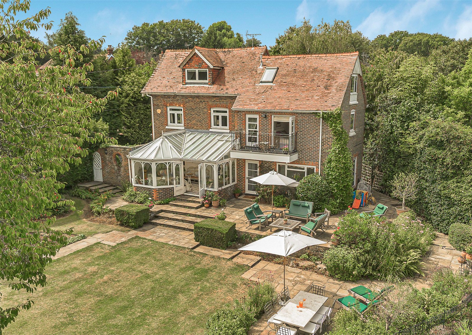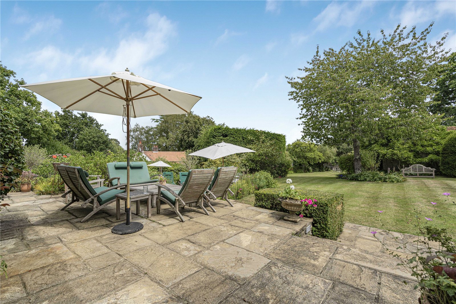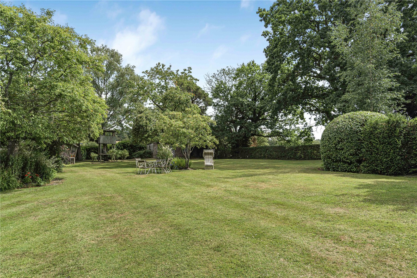 Garden : The garden is a particular feature of the property being large, well screened and beautifully landscaped. To the rear of the house is a wide raised paved stone sun terrace overlooking an extensive formal lawn bordered by well stocked beds and shrubs. To the far end of the garden is a large garden store and garden shed with an area set aside as a children’s play area.