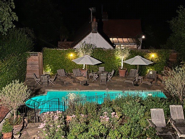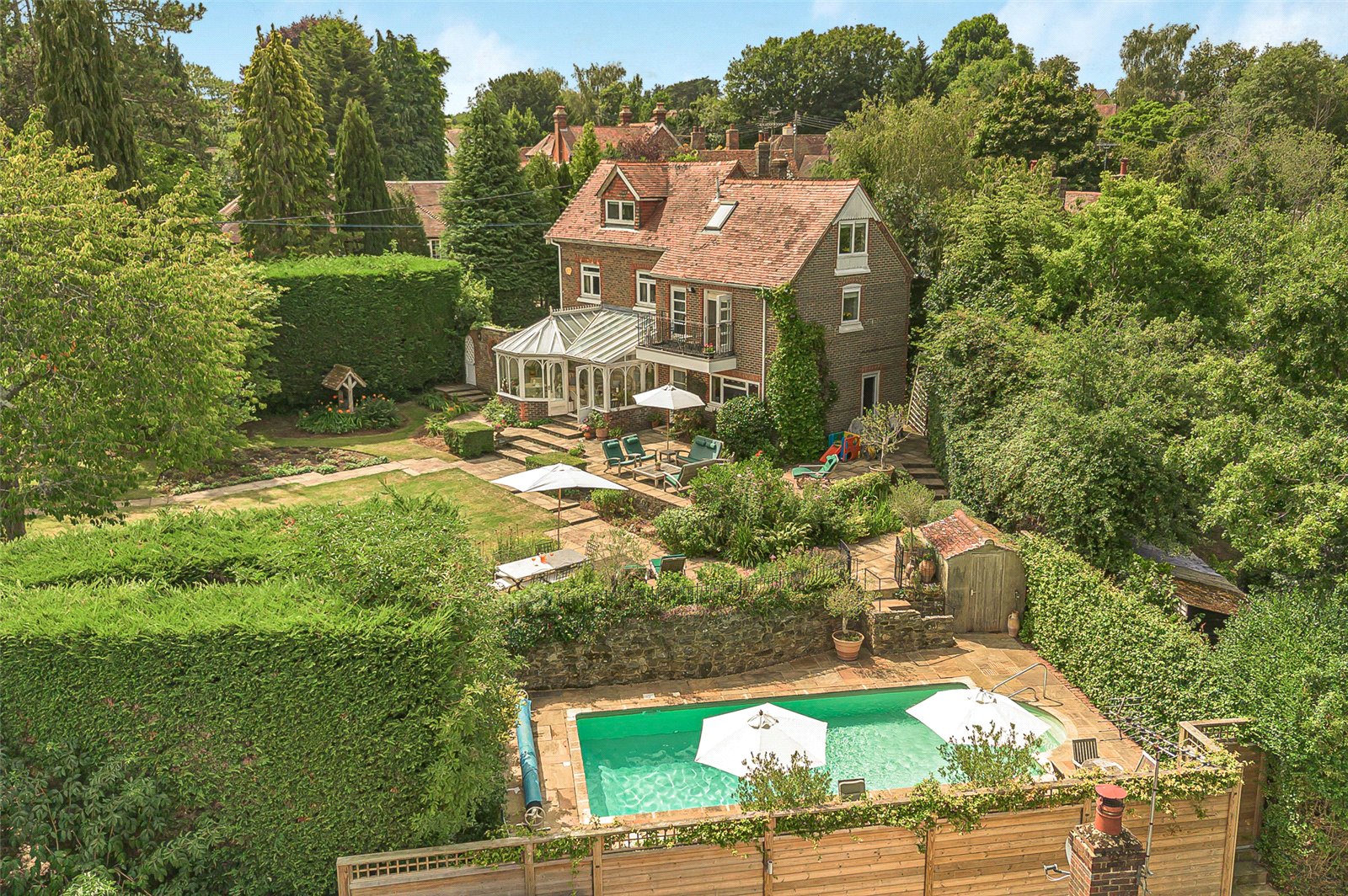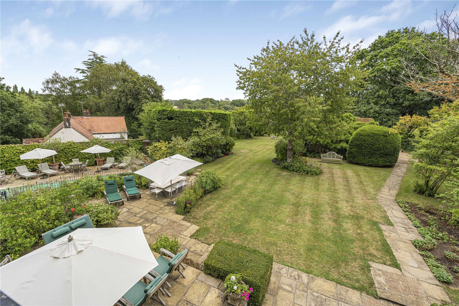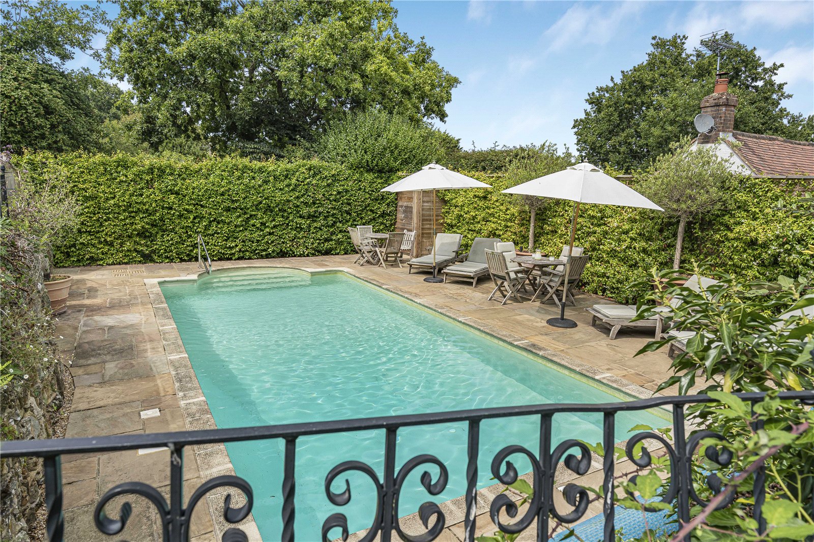 Off to the side of the property is a further courtyard garden area featuring a large paved surround with a heated swimming pool, screened for privacy and seclusion as well as sunbathing and dining.