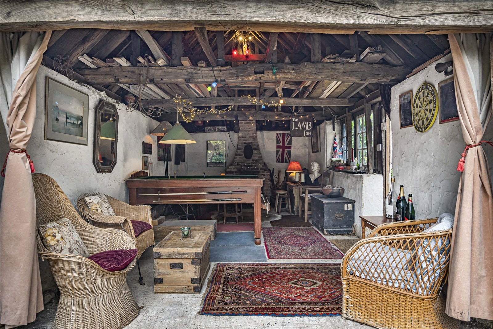stable door, oak doors from the local pub, The Blacksmiths Arms, and a wealth of exposed beams. Vaulted ceilings and brick fireplace creating an ideal games/hobbies area, home office or gym.