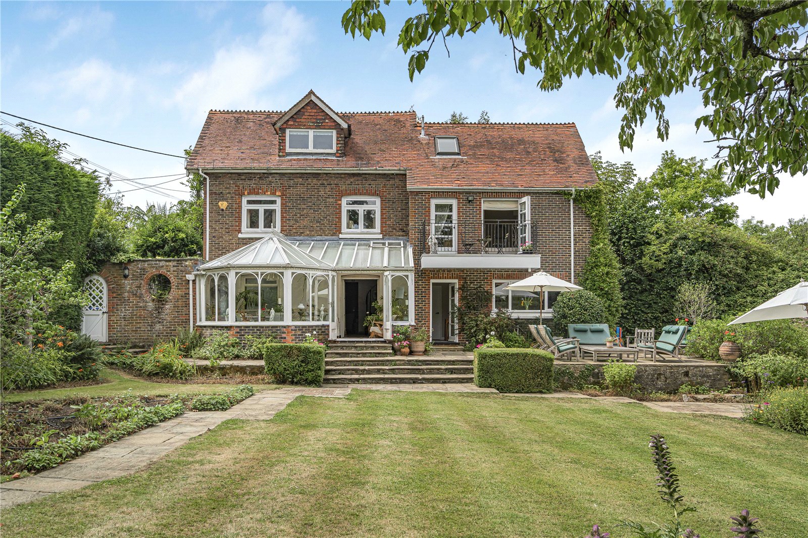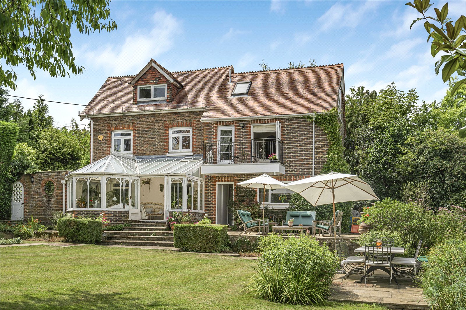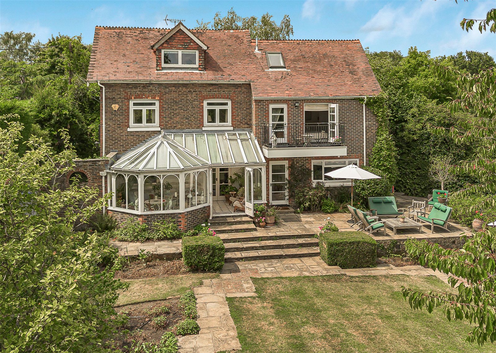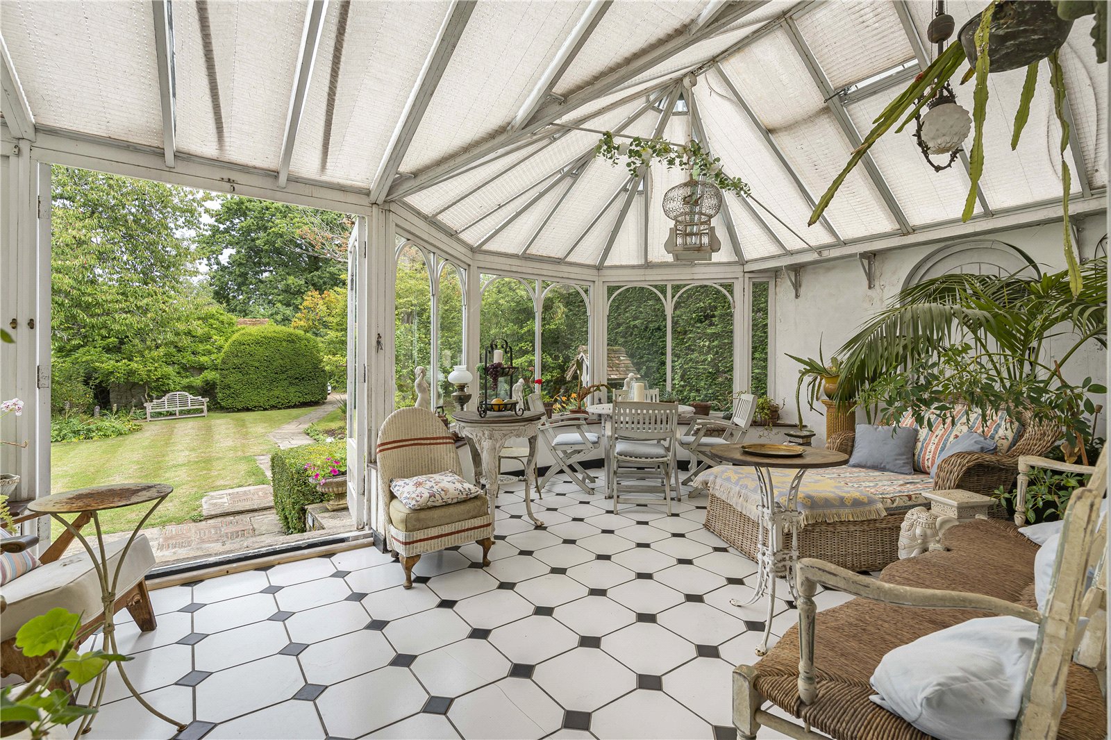 Conservatory: Tiled floor, delightful outlook to landscaped garden and double doors out to terrace.