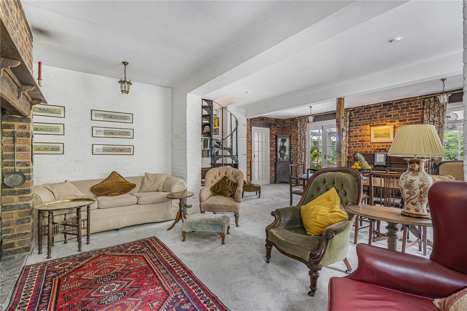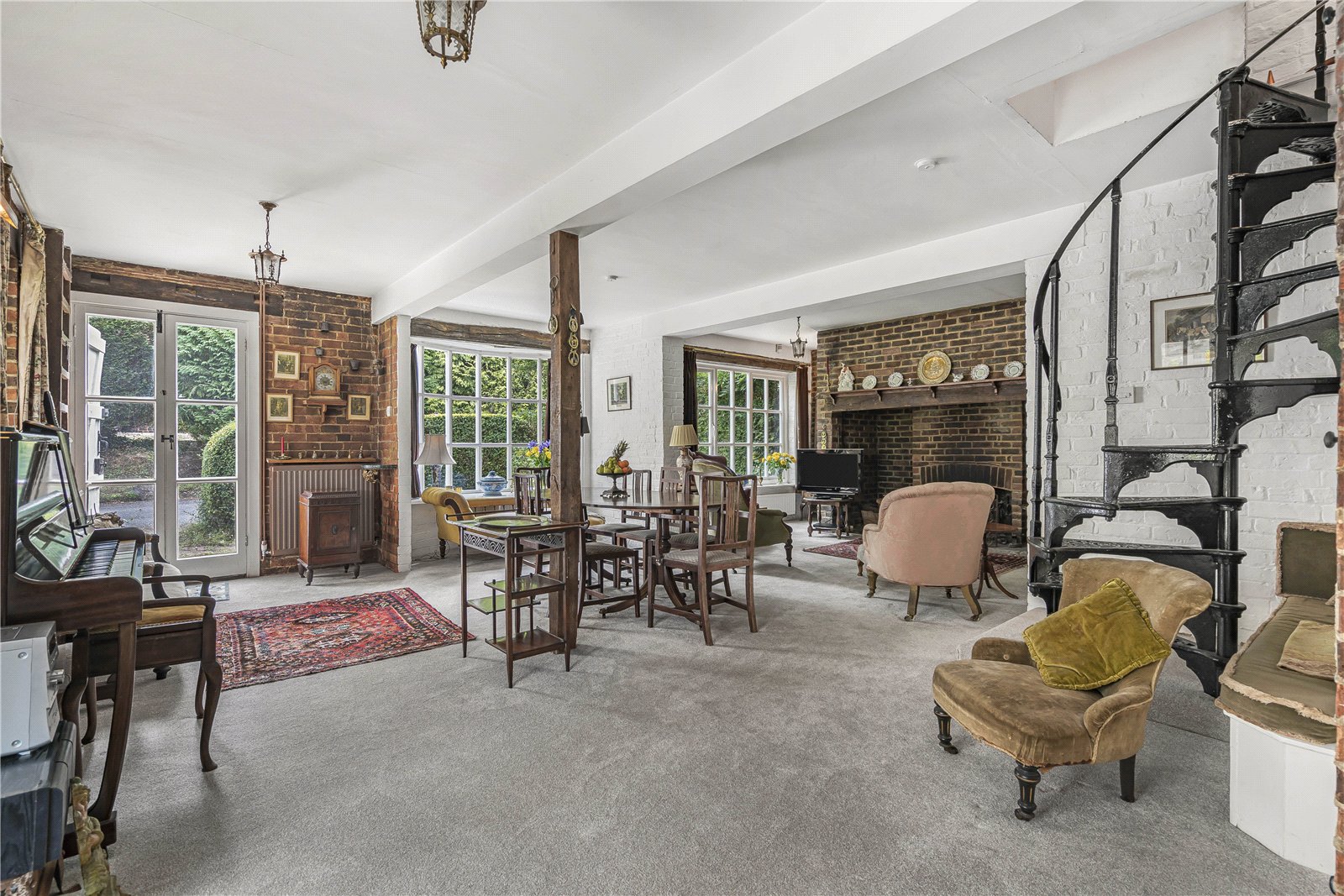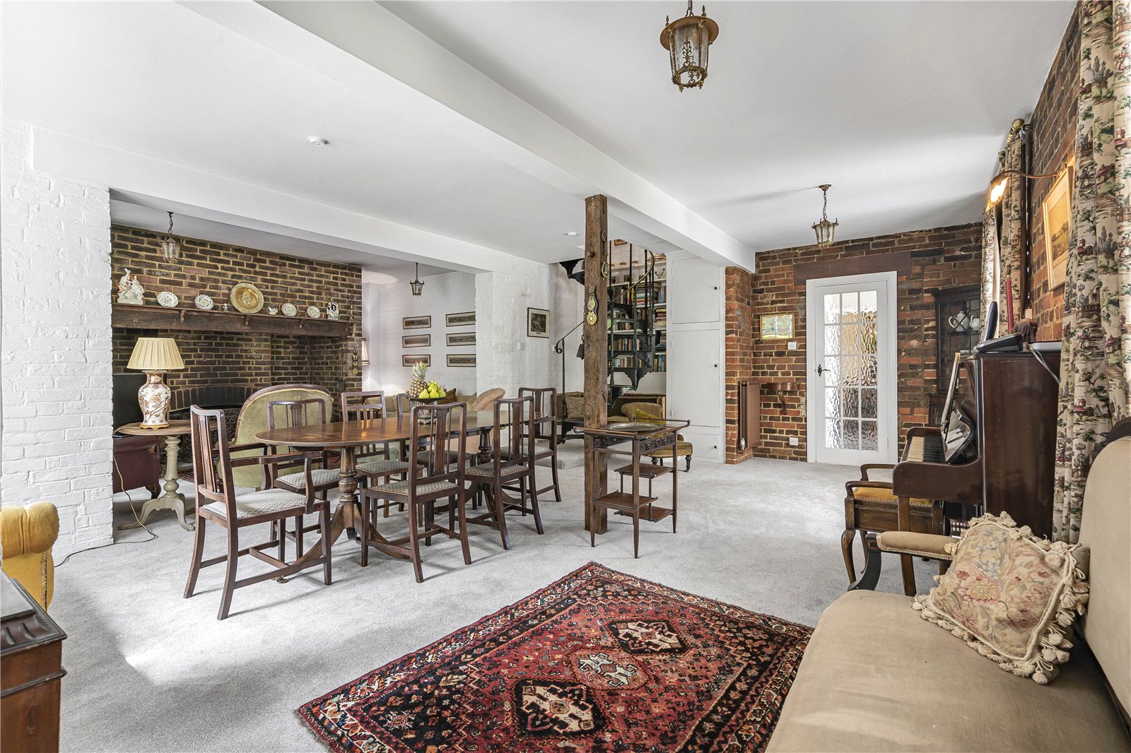 Reception Room / Dining Room : Featuring brick walls with the former granary ladder and an inglenook fireplace with brick surround, 2 radiators and striking spiral staircase to first floor with shelves and space for books. Feature upright beam, light points, double doors to outside and double doors to conservatory.