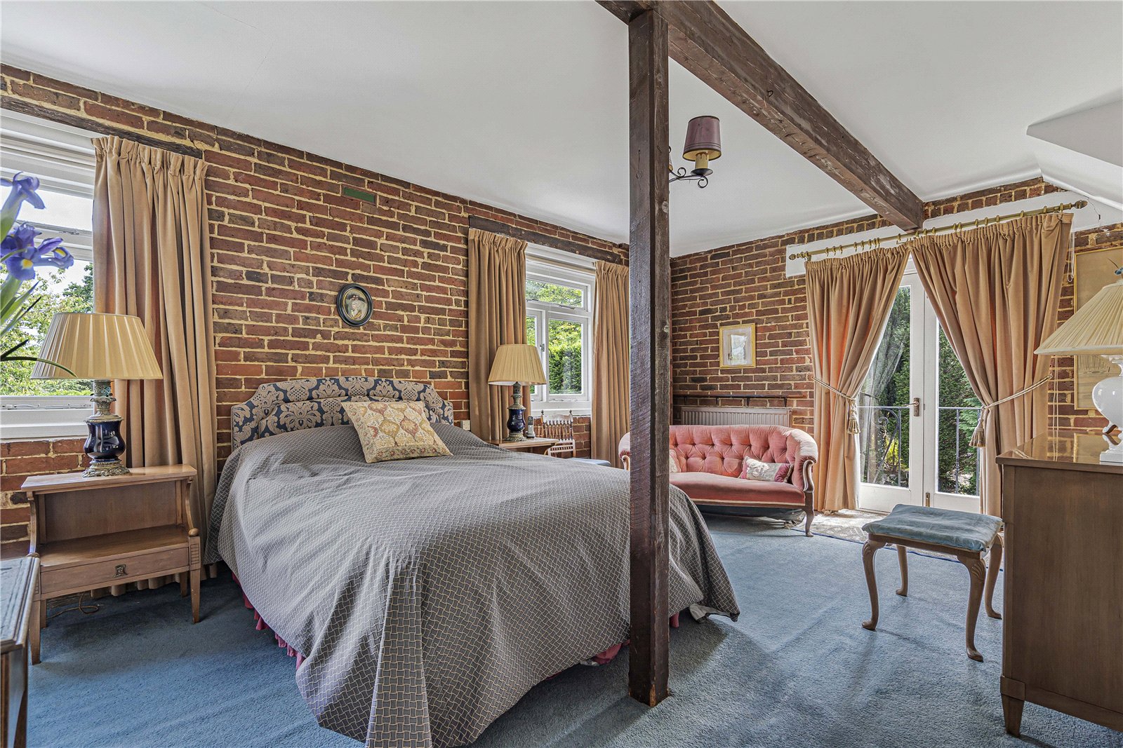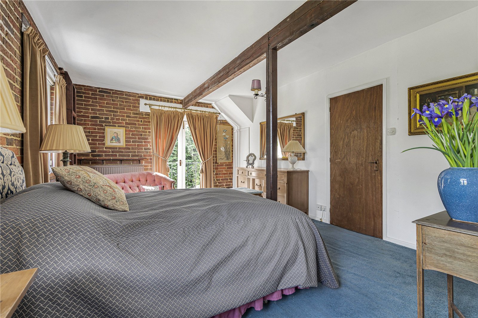 Bedroom 1 : Main double bedroom with exposed brick walls with former granary ladder, doors with Juliet balcony and deep cupboard. Beam and views over the garden. Door to: