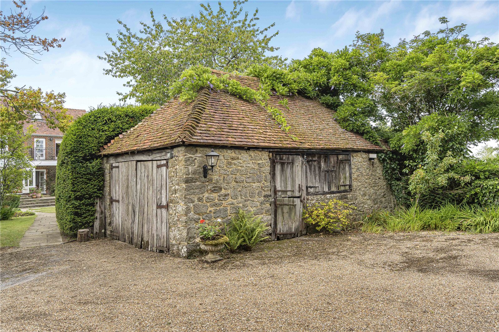 Barn / Outbuilding : A charming stone barn with pitched tiled roof featuring a