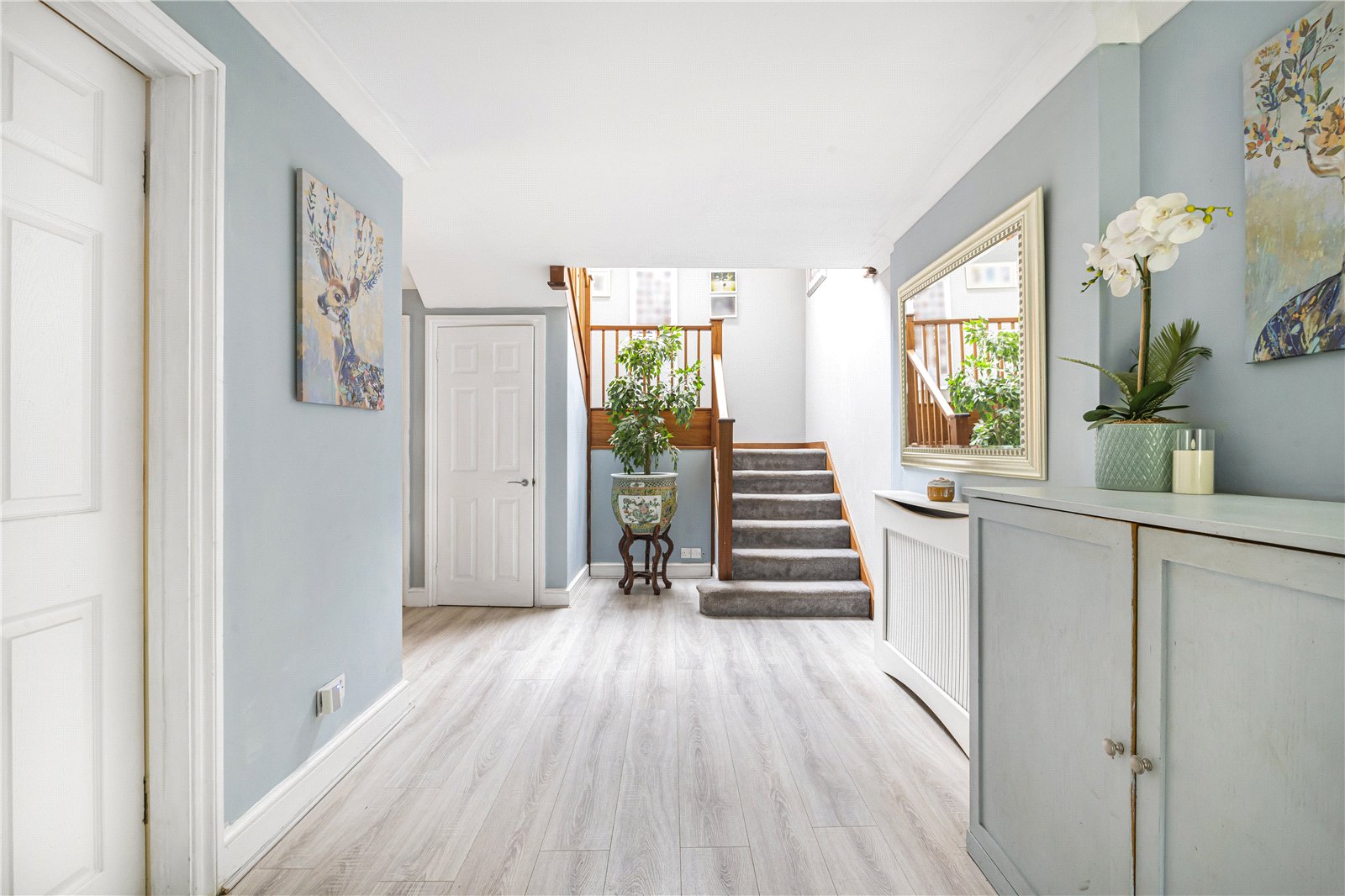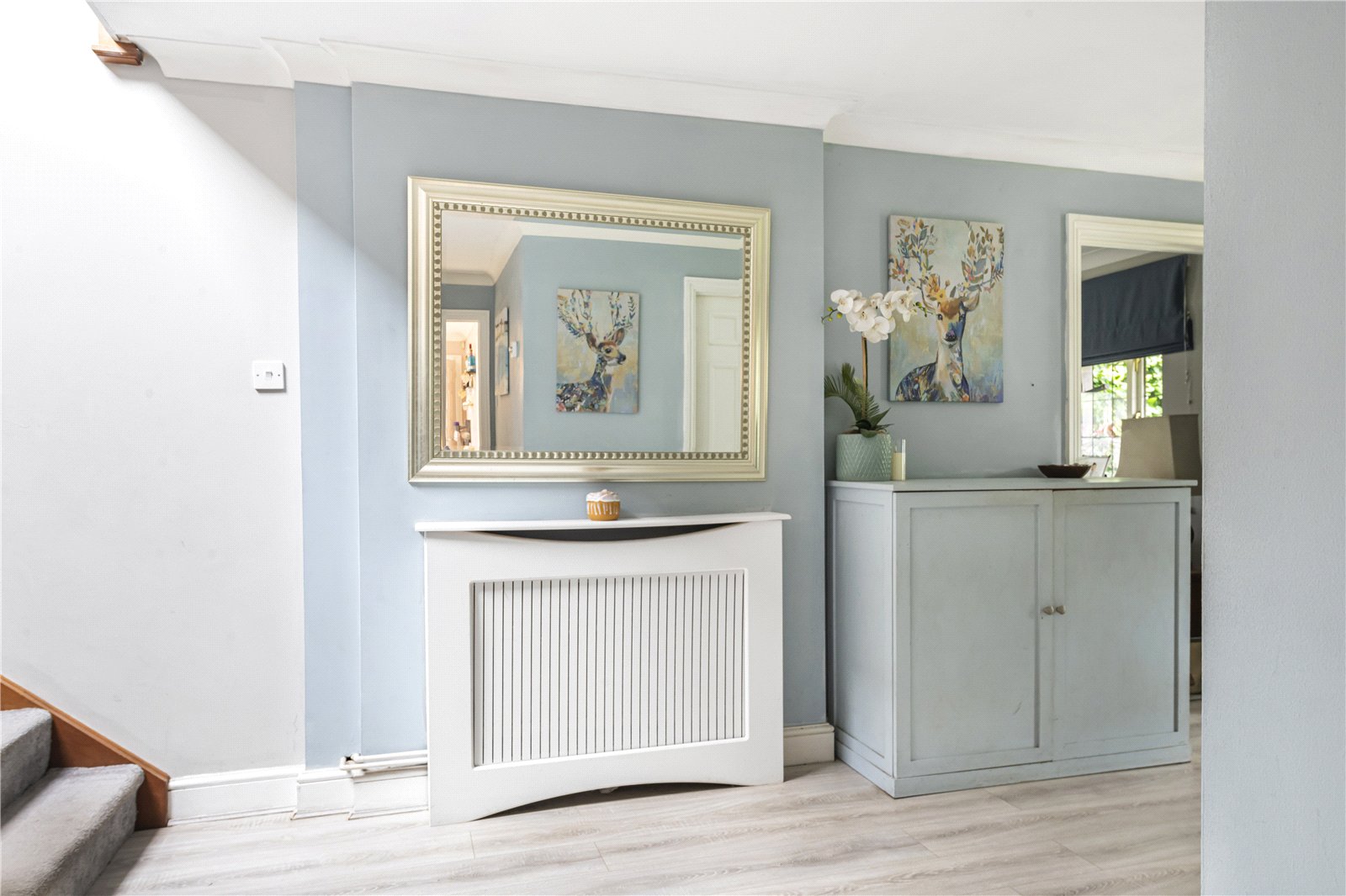 table with stirs to first floor. Under stairs storage, radiator with cover, telephone point and double doors to dining room.