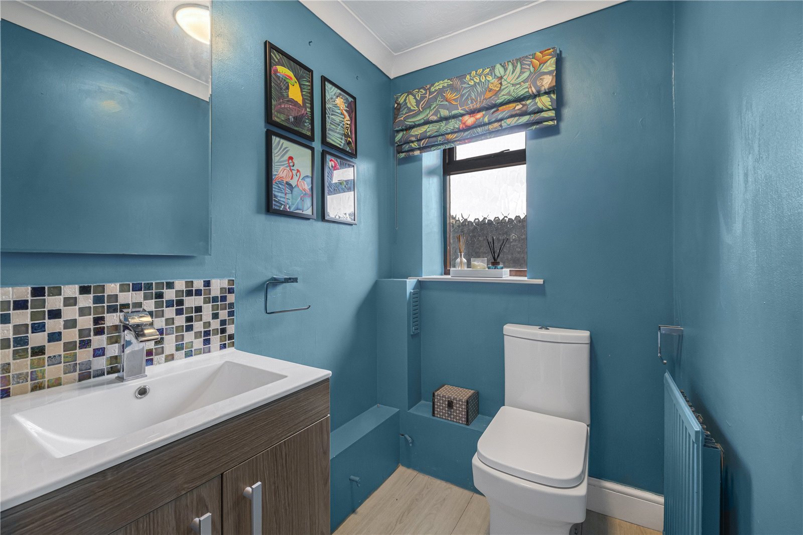 Cloakroom : Comprising WC with vanity unit and wash hand basin, part tiled wall, radiator.