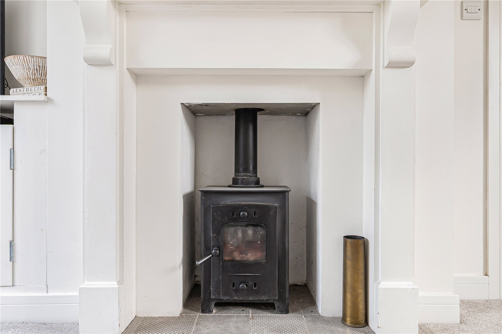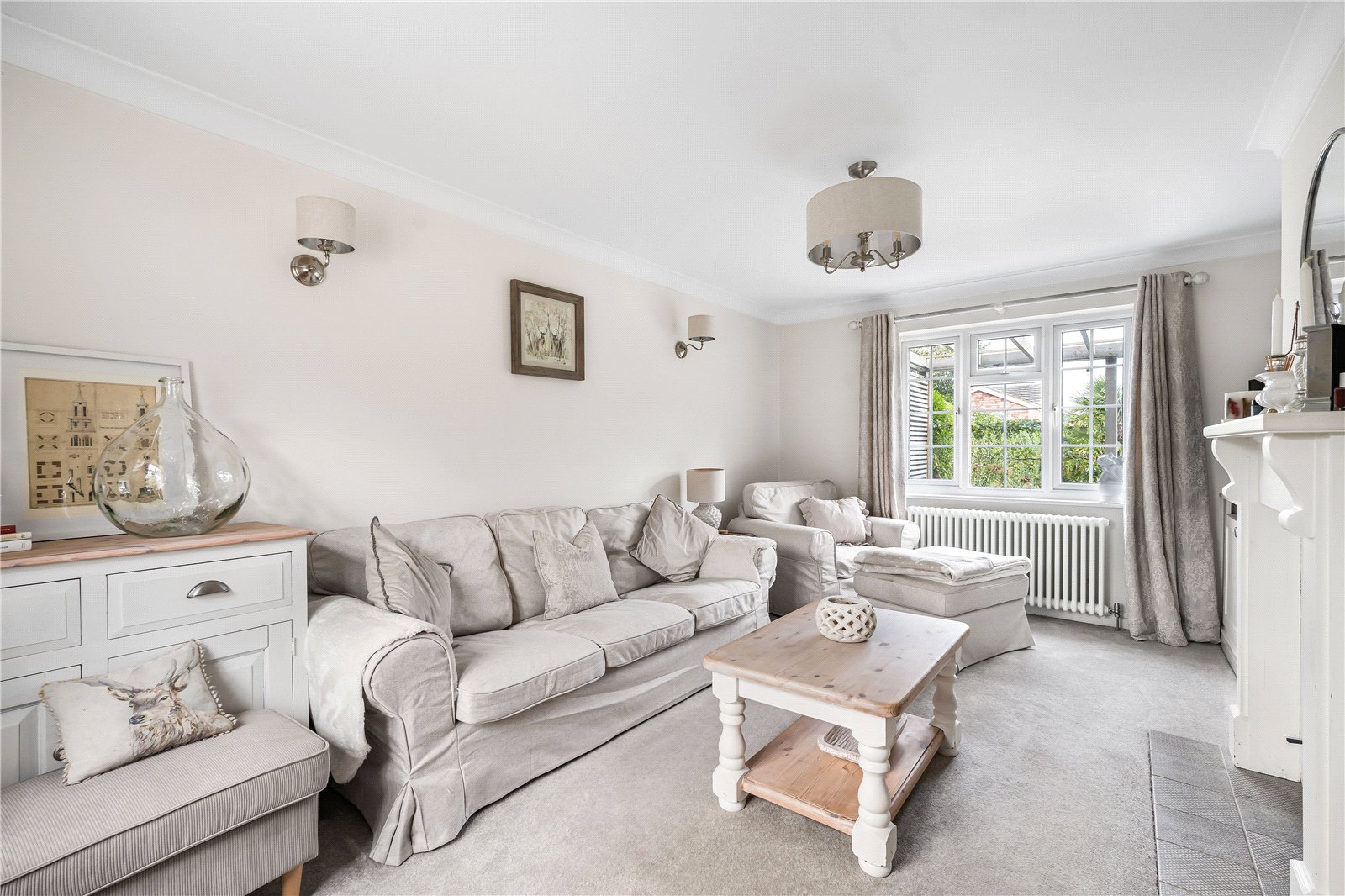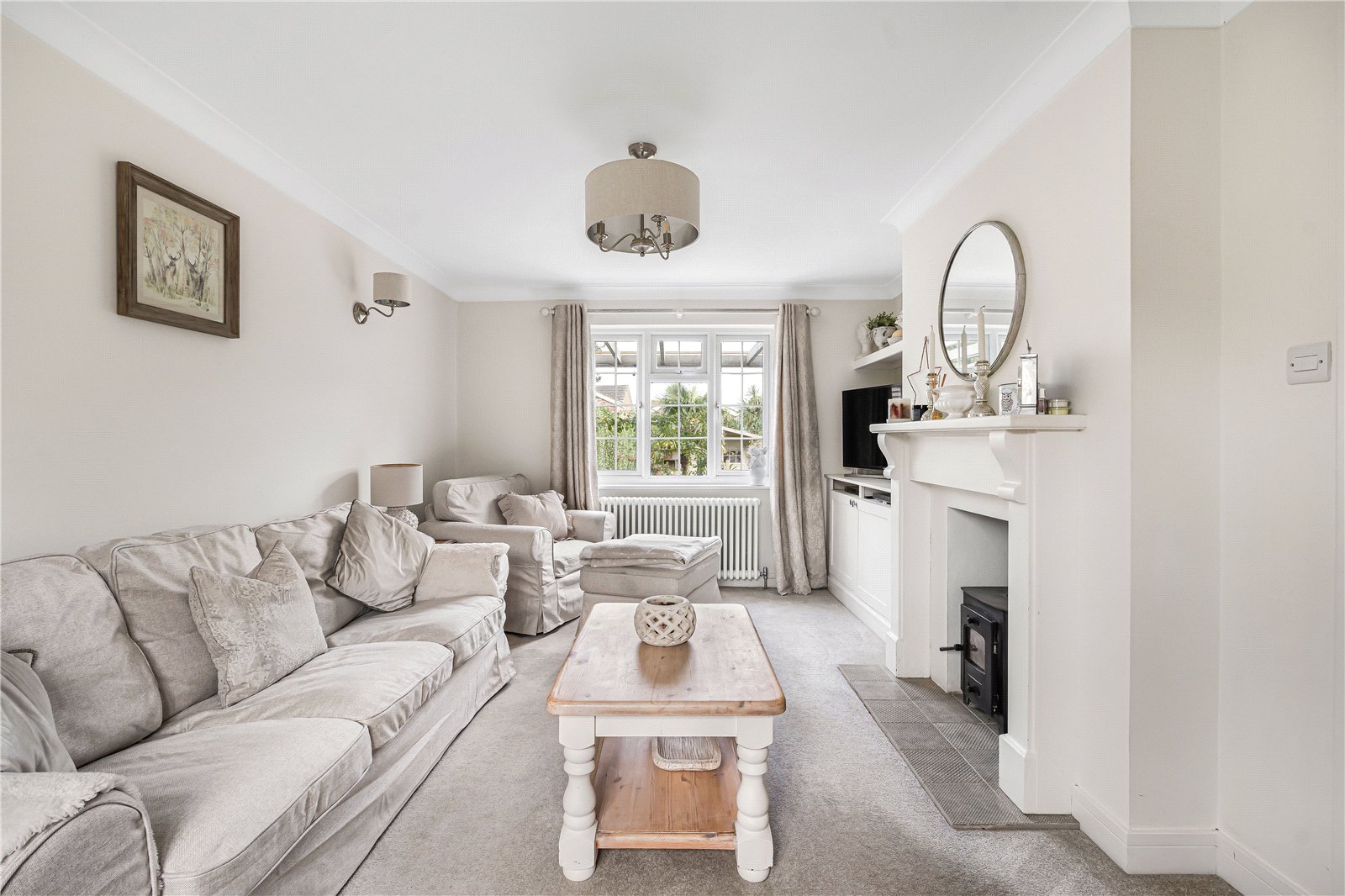 Sitting Room : Delightful, cosy formal reception room with fireplace surround with wood burning stove and a low range of storage cupboards with display top and shelf. Views to the garden, ornate radiator and wall and ceiling light points.