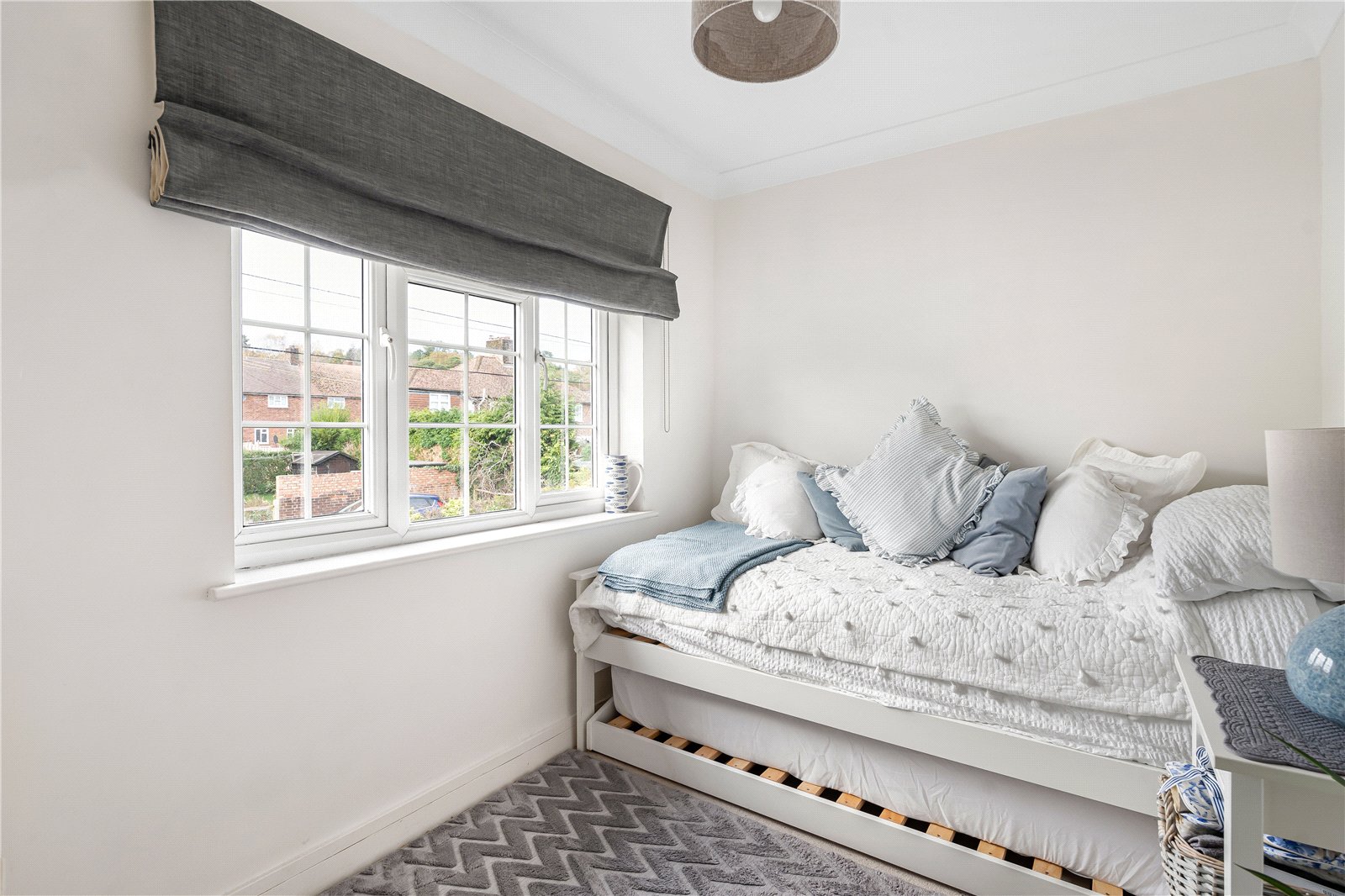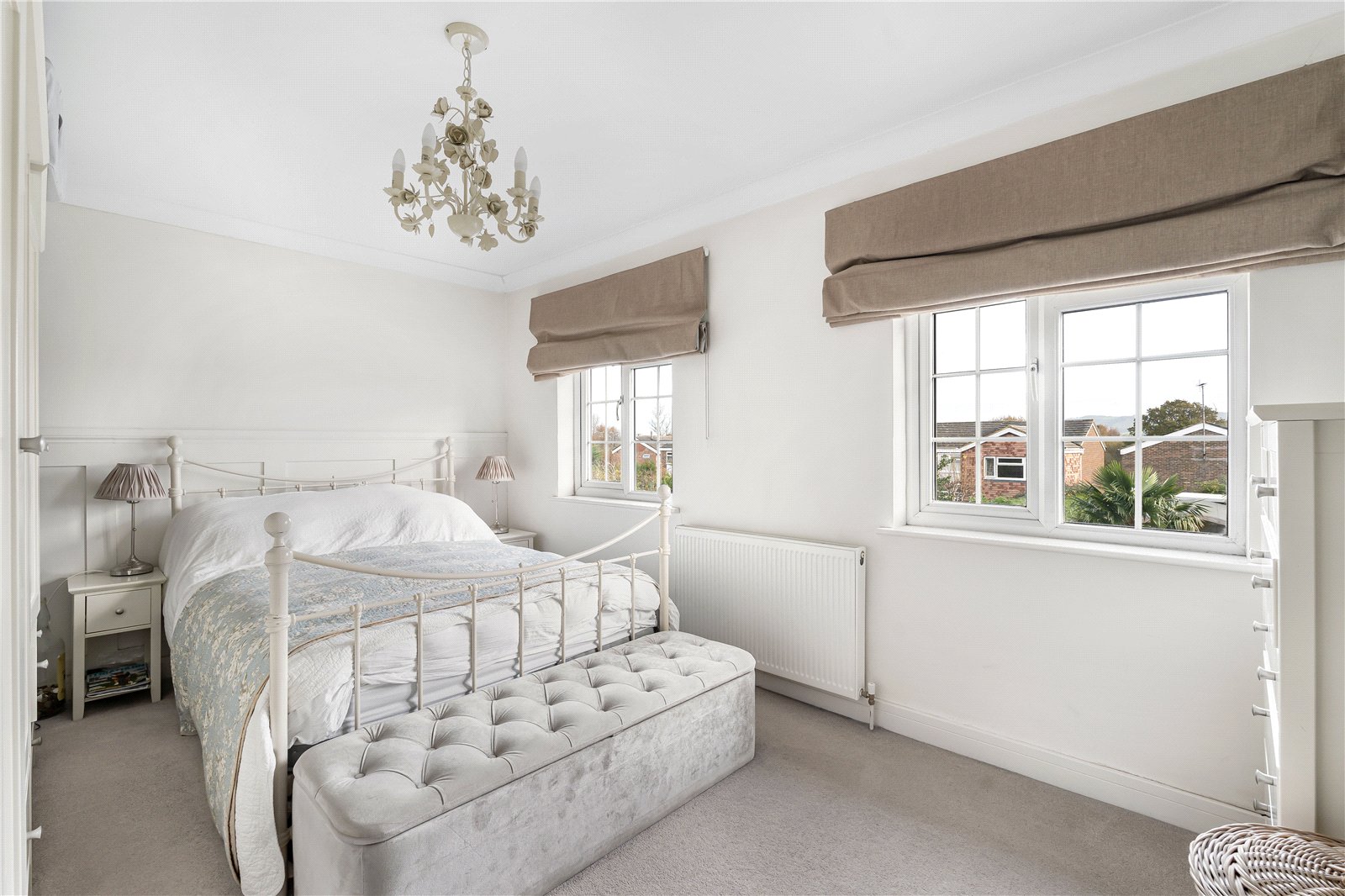 Bedroom 1: Double bedroom with views towards the South Downs in the distance. Recess with space for a range of wardrobes, radiator, and part panelled wall.