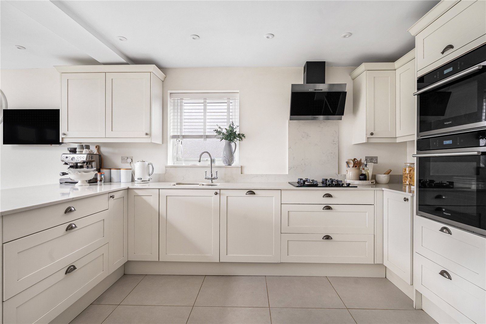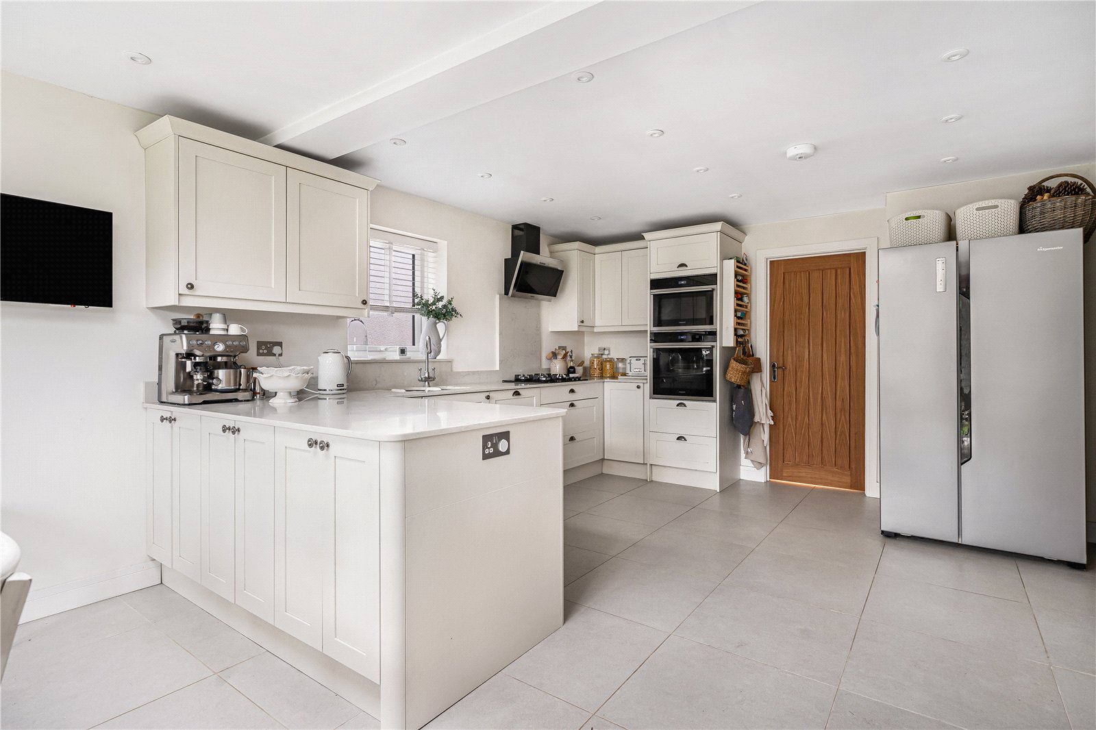 Kitchen/ Dining Room : Superb entertaining space boasting a modern range of kitchen units in a neutral Shaker style finish and comprising matching wall and base units with pan drawers. Built-in dishwasher, built-in oven with microwave oven over, space for large American style fridge freezer, 4 ring gas hob and contemporary cooker hood above. Excellent range of quartz work surfaces with 1 and ½ bowl sink unit, tiled floor, ornate vertical radiator and down lights.