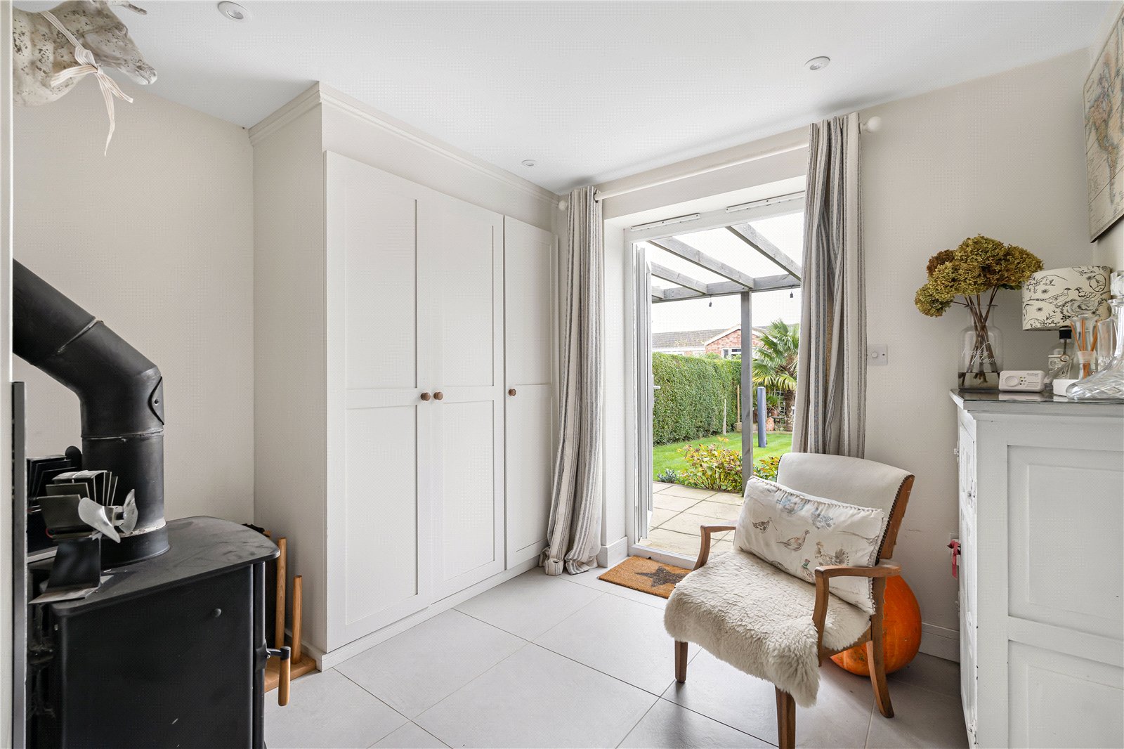 Reception Area / Snug : With wood burning stove, tiled floor, built in range of cupboards, double doors to terrace and garden. Space for seating or ideal as a snug/reading area. Sliding door to :