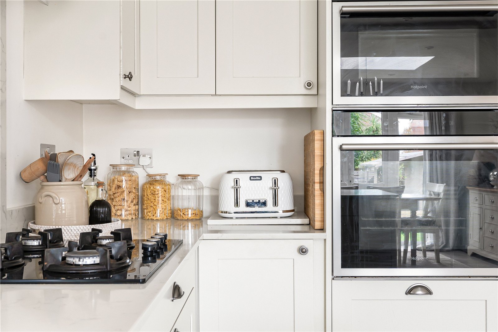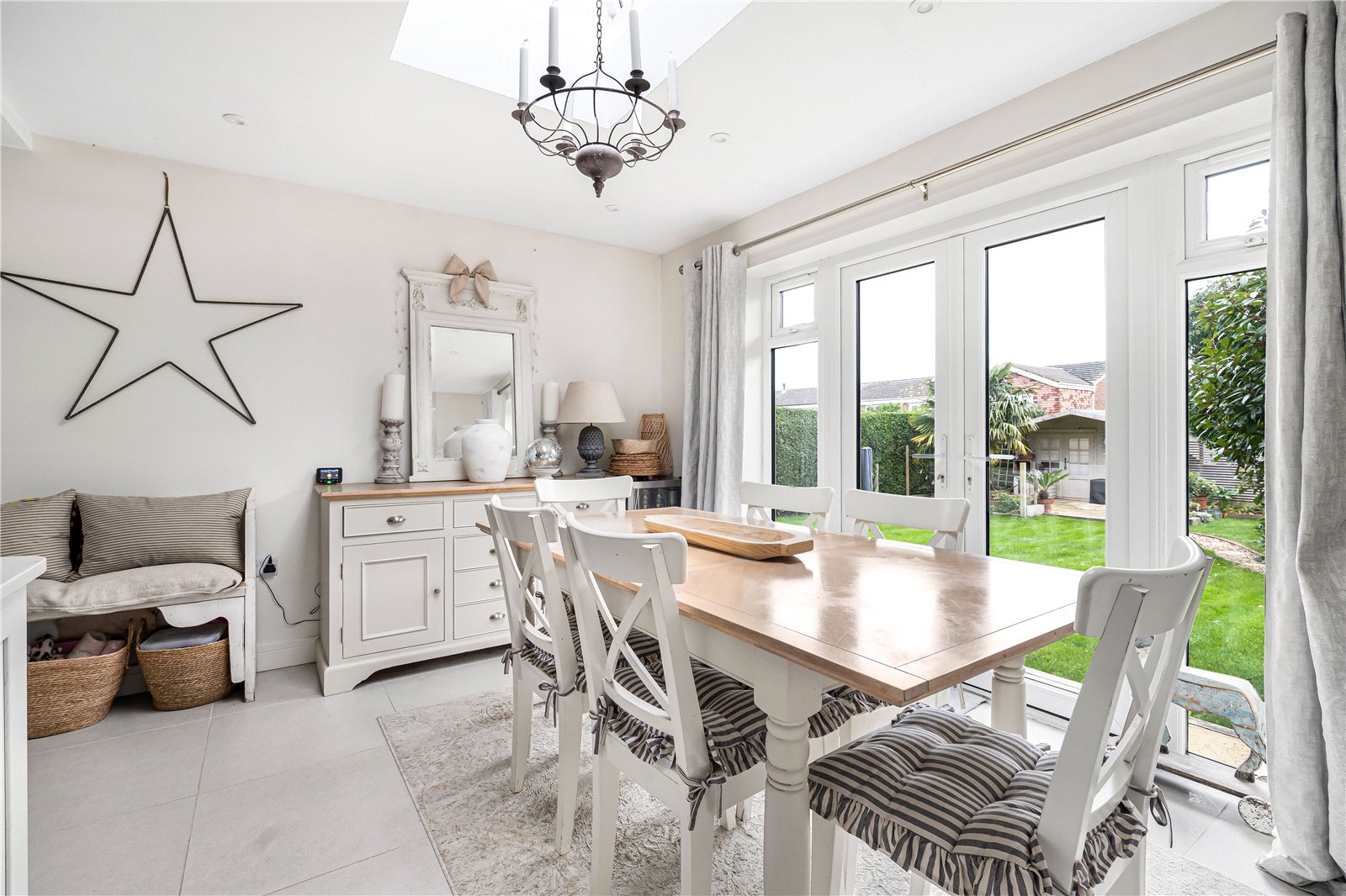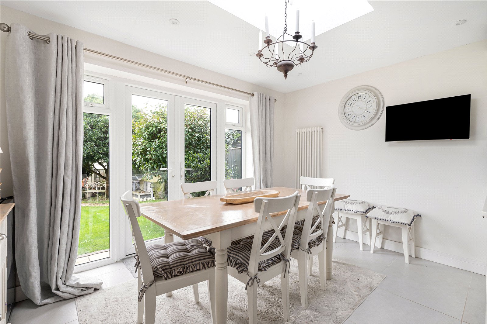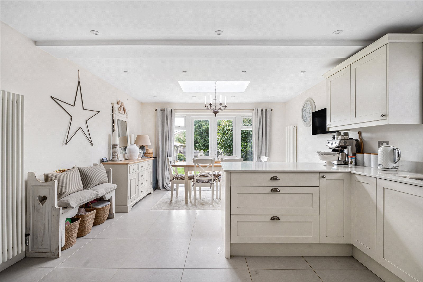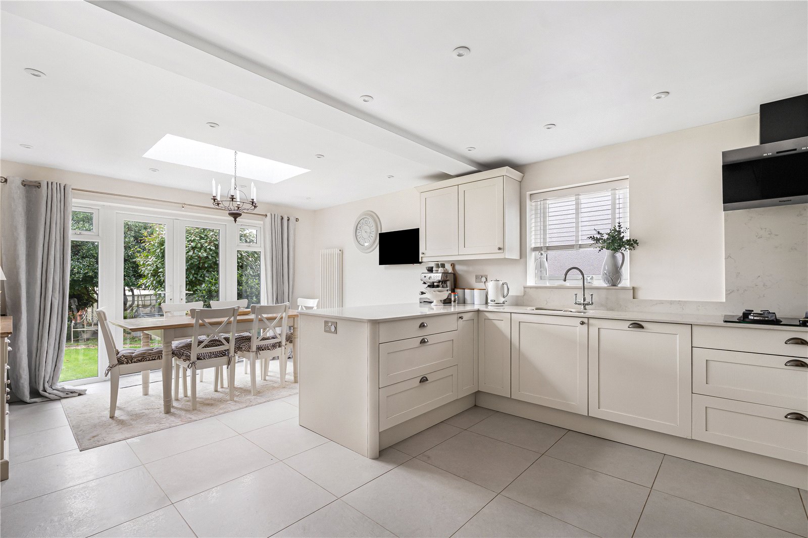 Open to a generous Dining Area featuring a roof lantern and a dual aspect with views into the garden. Space for dining suite, range of low level cupboards, double doors to garden and terrace, space for wall mounted television.