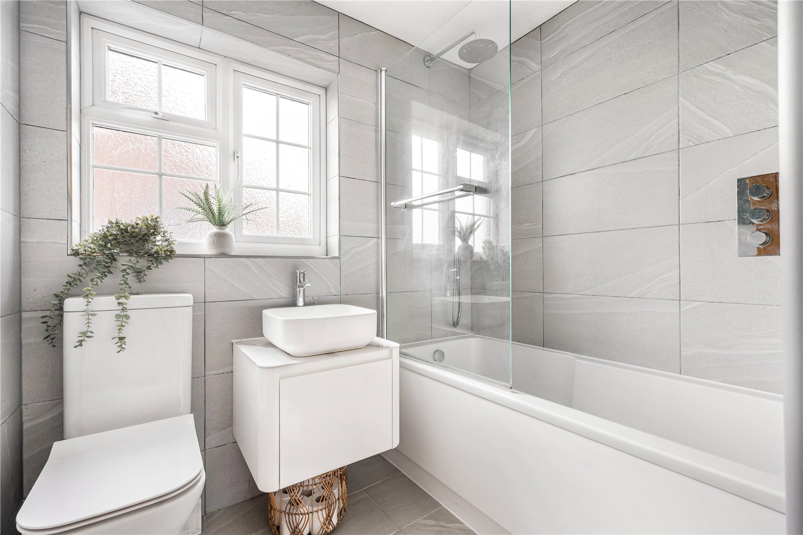 Bathroom : Modern suite comprising bath with shower screen and wall mounted shower controls, WC and vanity unit with wash hand basin. Ladder radiator, tiled floor and walls and wall mounted mirror with bluetooth, demister and light.