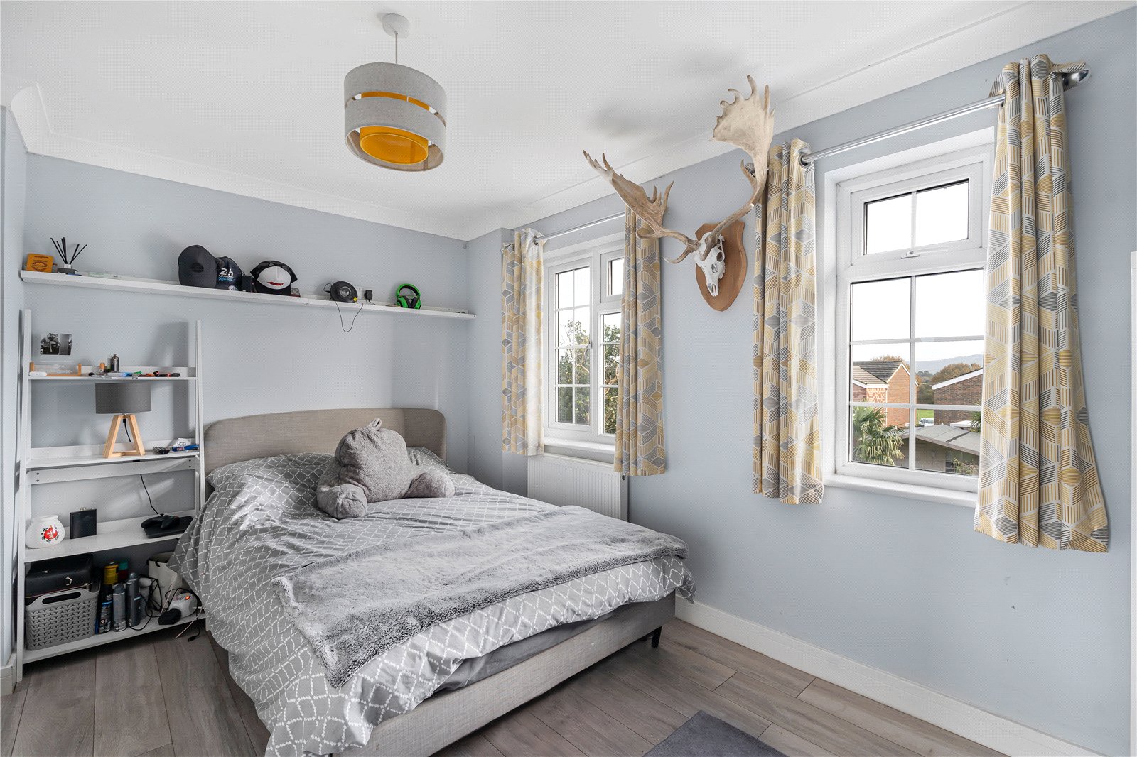 Bedroom 2: Double bedroom with grey laminate oak effect flooring, distant views towards the South Downs, radiator, and space for wall television.