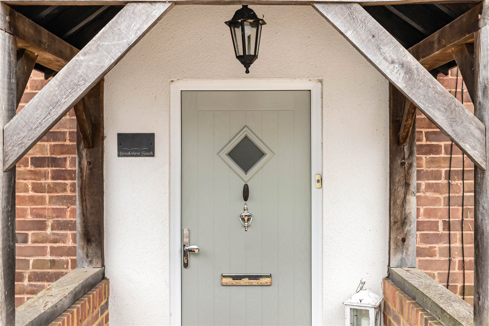 Striking oak framed porch with pitched tiled roof and front door to: