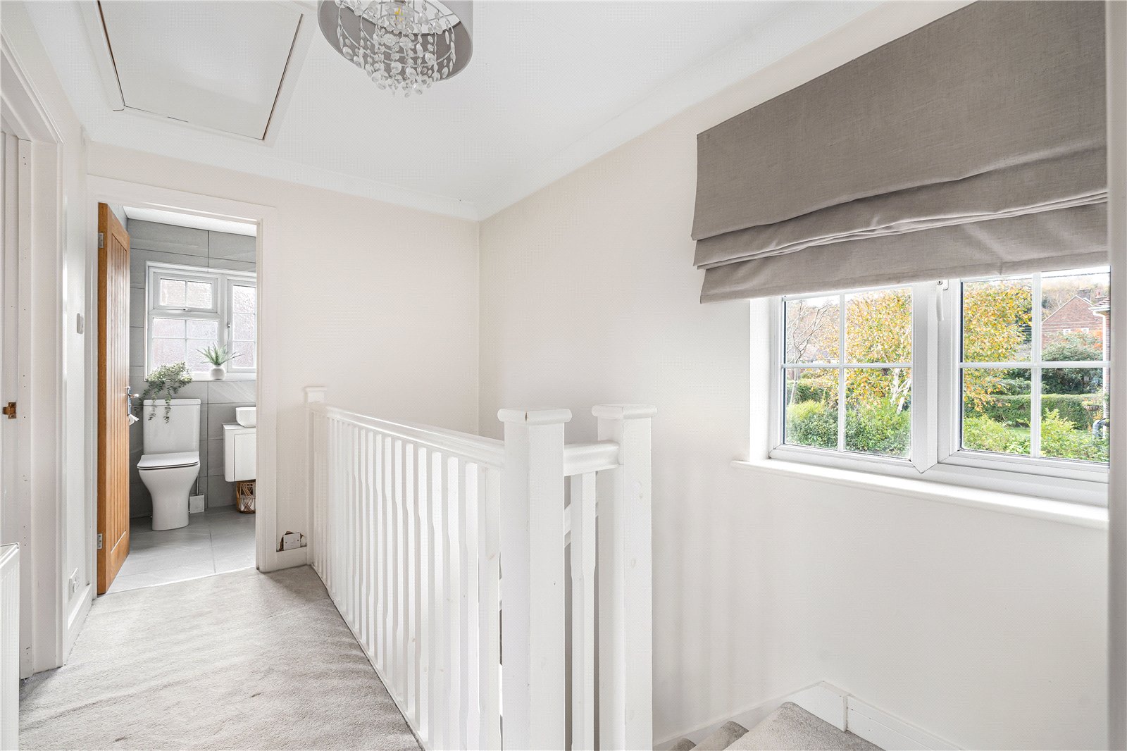 Landing : Bright landing with flank window, radiator and hatch to insulated and boarded roof space with light point and folding wood ladder. Boiler and hot tank located in the loft.