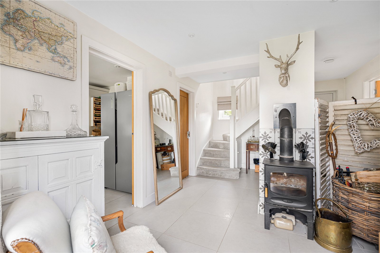 Reception Hall : Tiled floor with ornate style radiator, turned stairs to first floor with cupboard and understairs space for table and downlights. Open plan into :