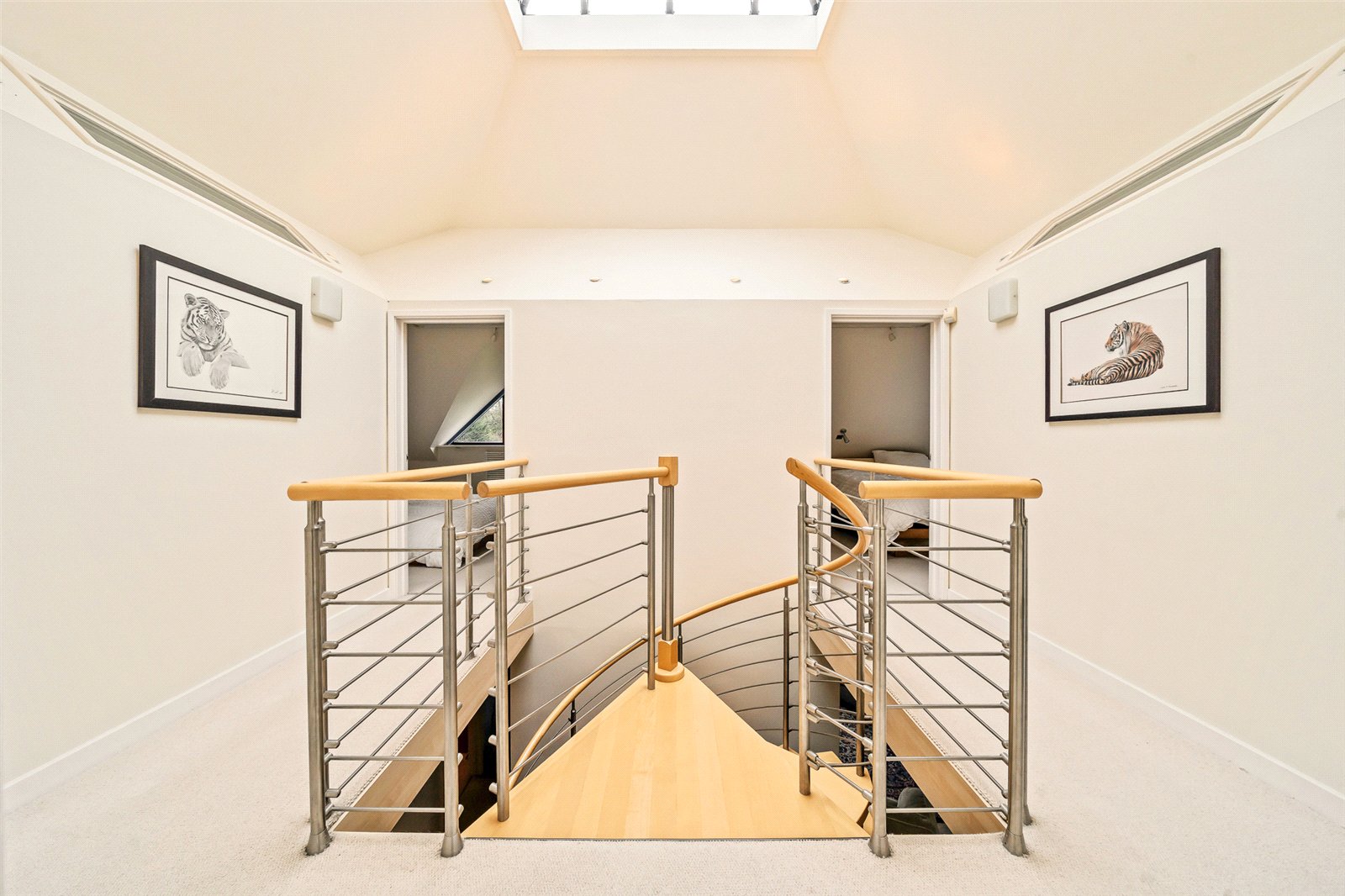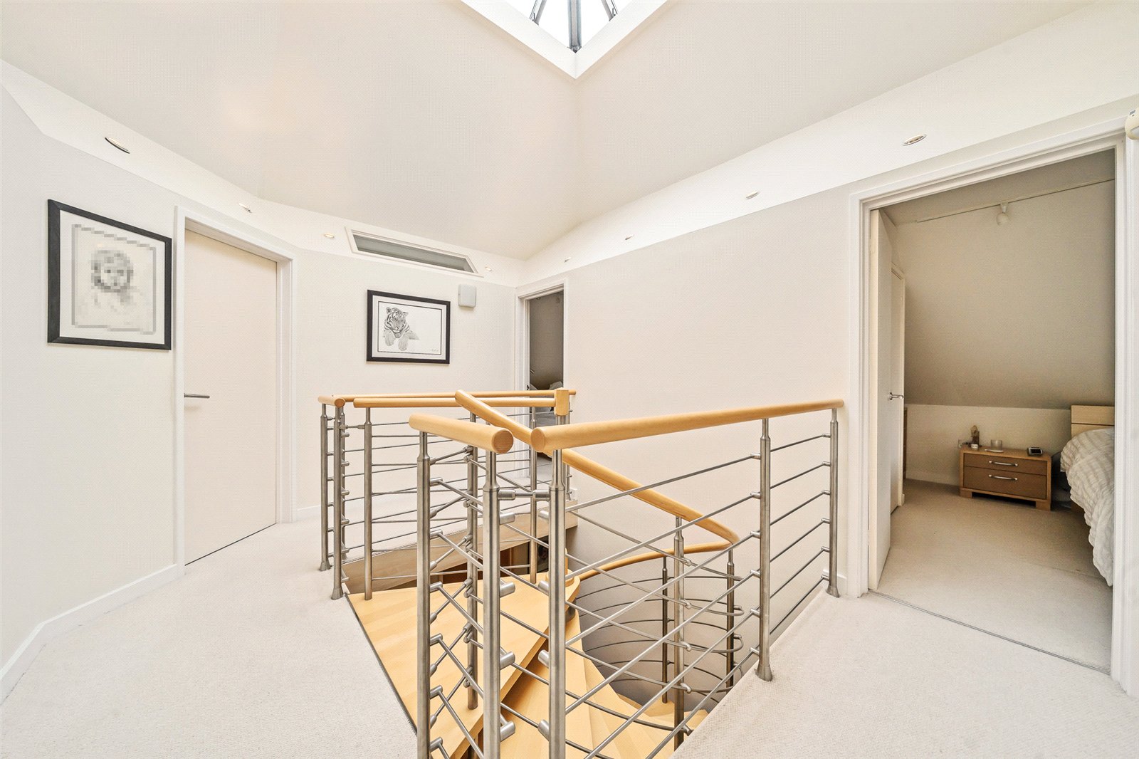 Landing : Impressive vaulted landing with pyramid shaped lantern skylight and uplighters creating a bright and striking contemporary finish.