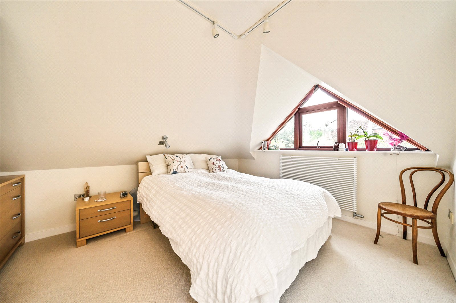 Bedroom : Triangular feature window with ladder radiator, 2 single cupboards, wide range of low storage cupboards and track light point.