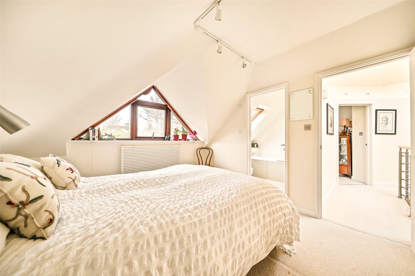 Bedroom : Superb triangular feature window frame, track for lighting, built-in wardrobes with recess for chest of drawers, ladder style radiator, reading light point, TV point and door to