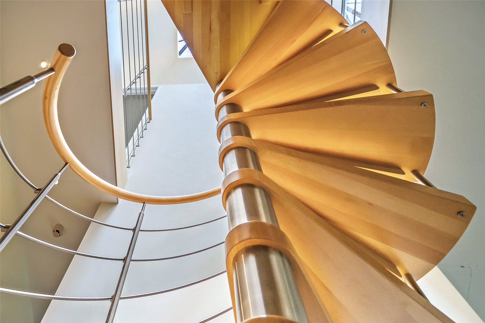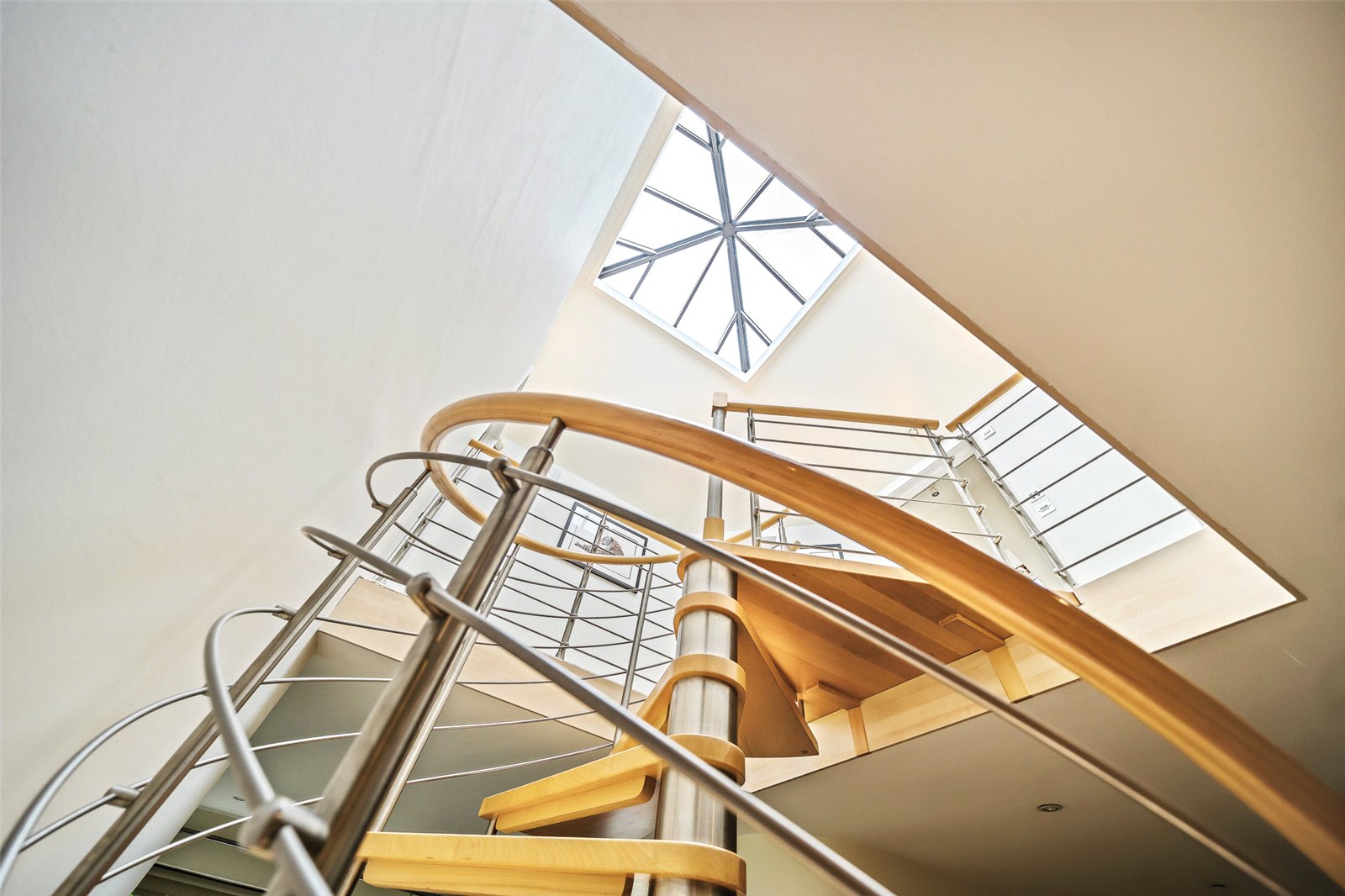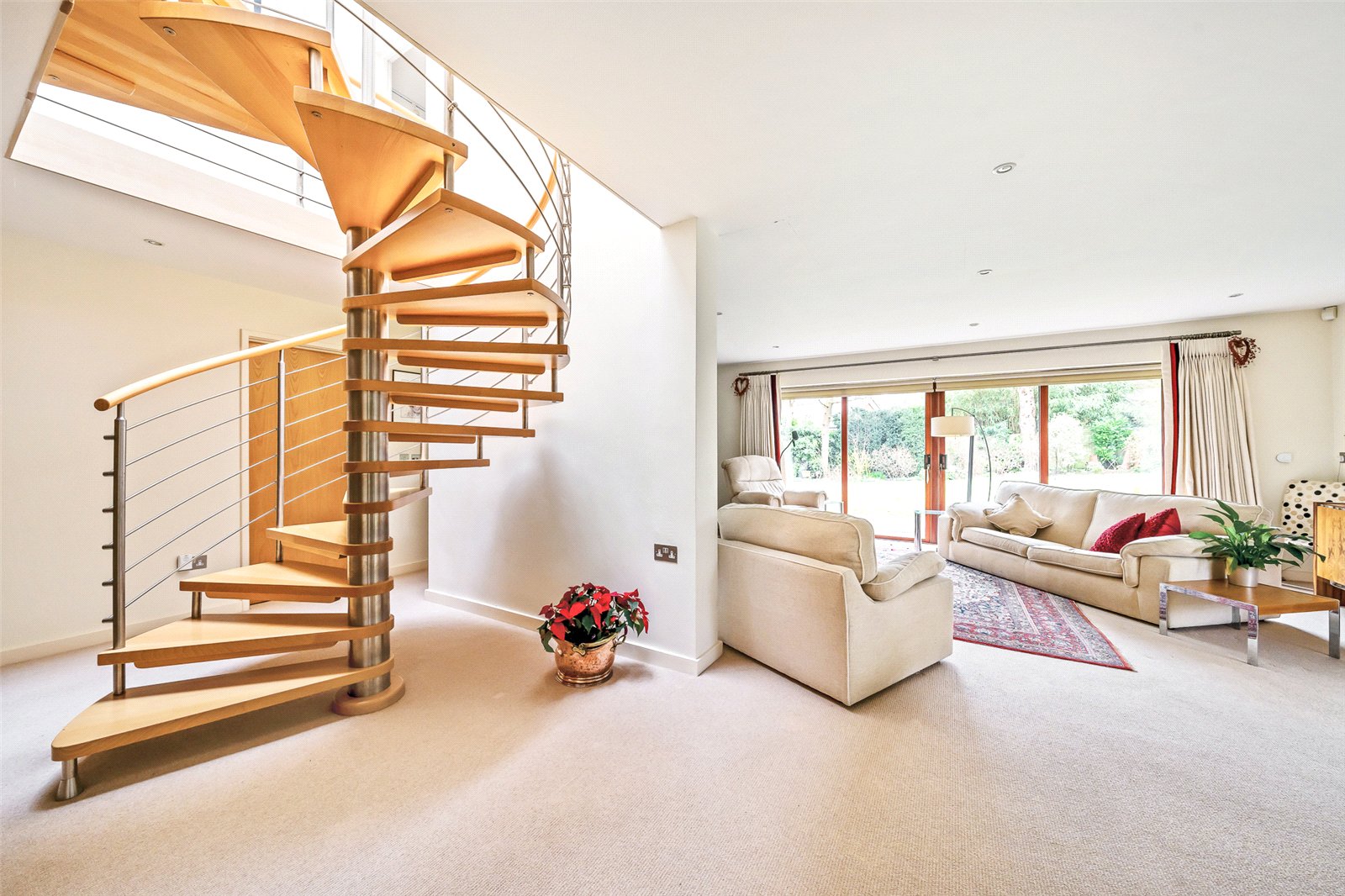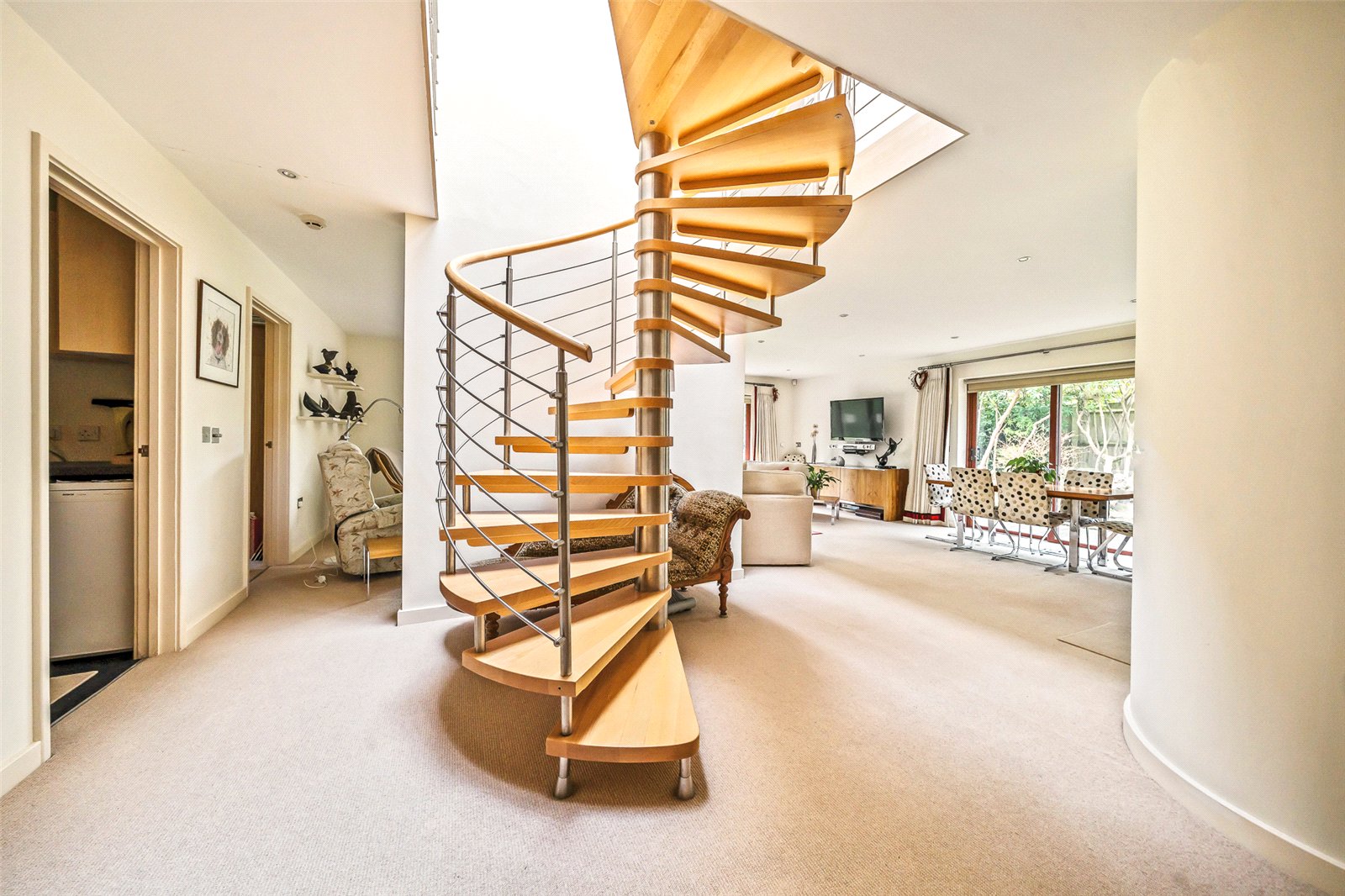 Wide, open area leading to the striking Italian steel and beech spiral staircase with access into the main reception area.