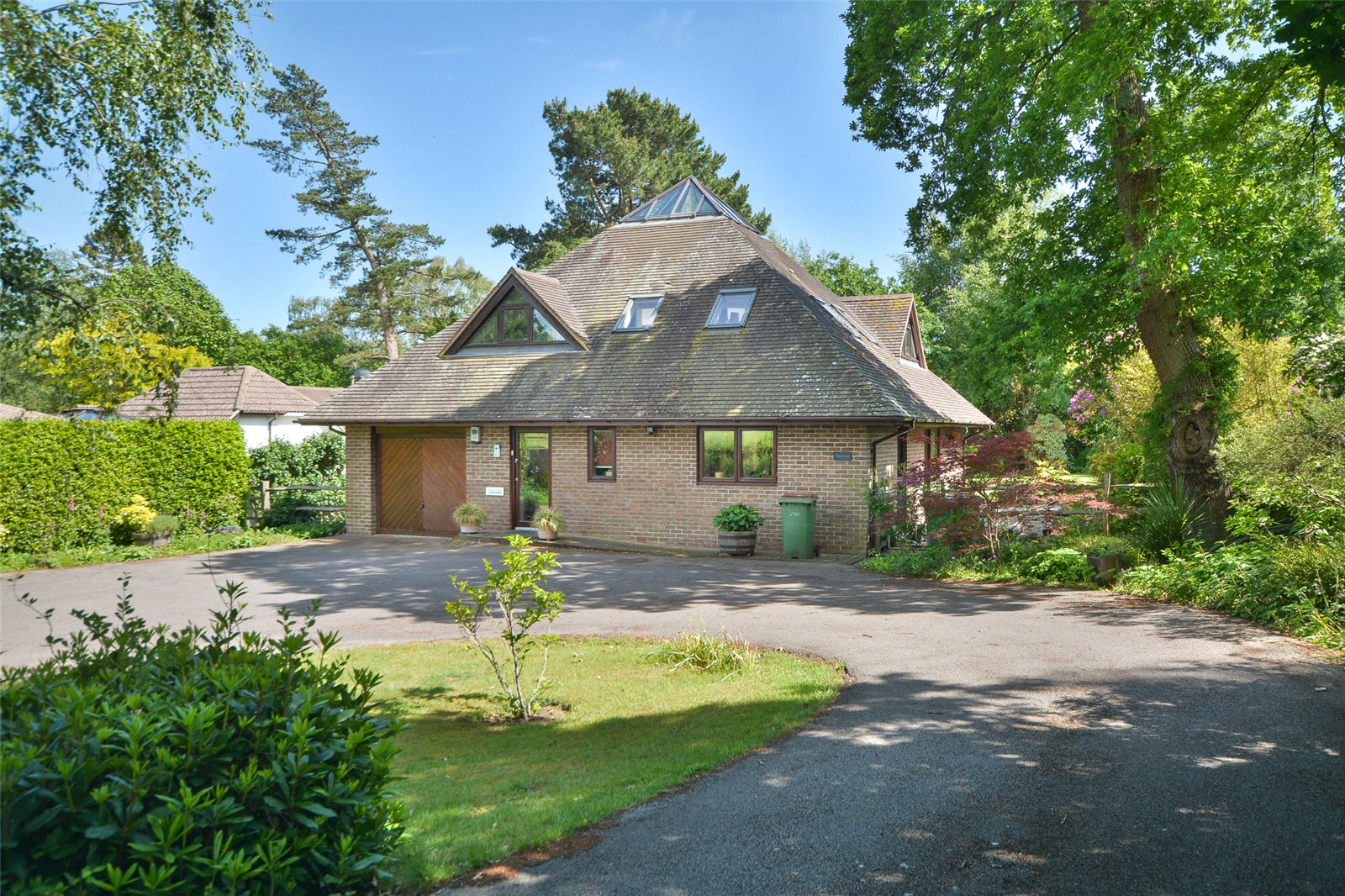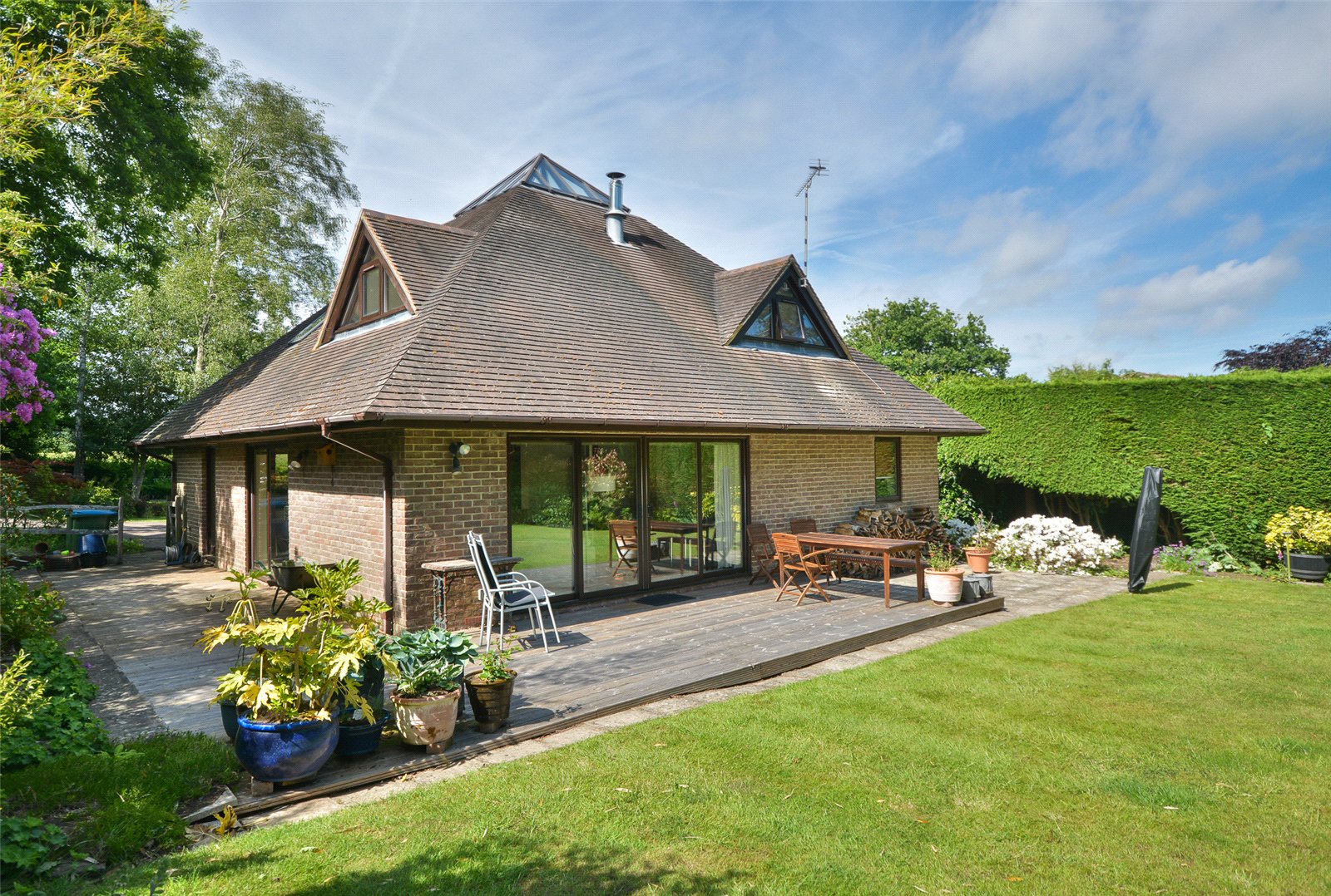 A striking, architect designed home featuring stylish, open plan living with a wonderful pyramid skylight – delightful garden and a quiet semi-rural location off a country lane.