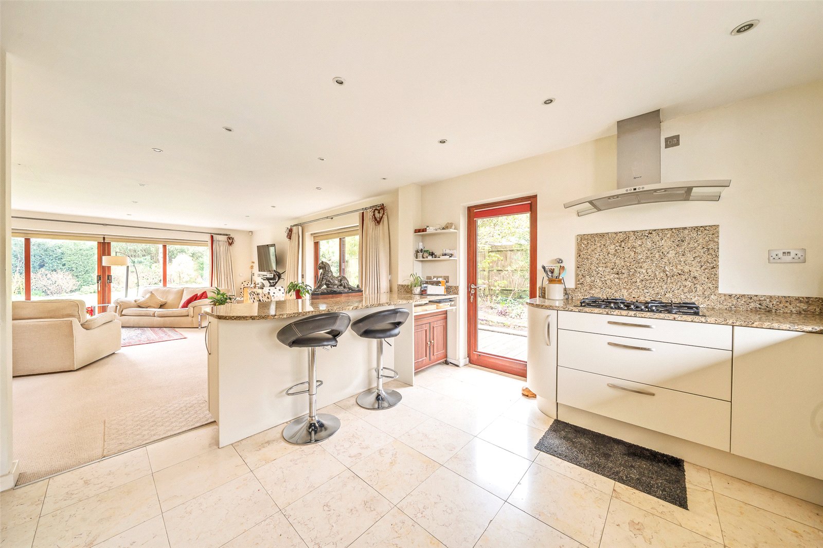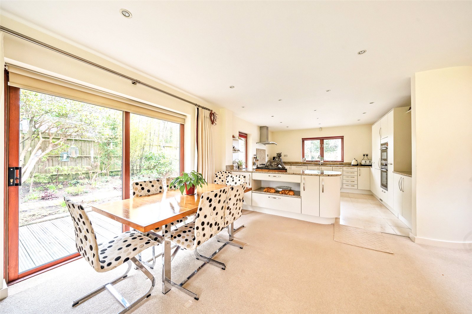 Bright double aspect with sliding doors opening on to a deck and the rear garden. Contemporary raised stainless steel fire, TV and telephone points, down lights, space for dining suite, space for wall mounted television and underfloor heating Kitchen : Modern range of kitchen units comprising wall and base units with drawers, pull out bin, pull out larder racks and integral fridge with freezer box. Built-in double oven incorporating microwave, gas hob with stainless steel cooker hood, peninsular breakfast bar with storage and shelf, underfloor heating and excellent range of work tops in granite with inset sink unit. Views to the front and fields beyond the lane. Side door to garden.