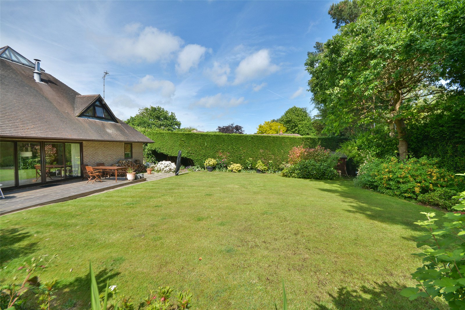 The rear garden is a good size and comprises a shaped lawn with deep well stocked borders featuring hedging and fencing. There is a wide timber sun deck and adjoining terrace with access to both sides. The garden at the rear faces south and the plot extends to 0.28 acres.