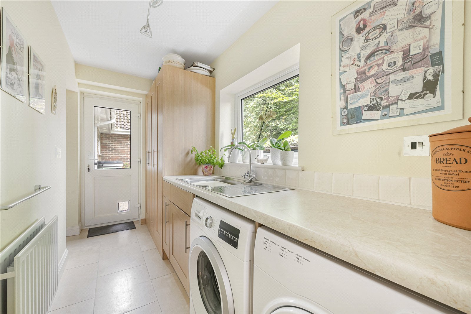 Utility Room : Comprising units with work top and sink with spaces for fridge freezer, washing machine and dryer. Drying cupboard with radiator, radiator, door to outside, cupboard and light point.
