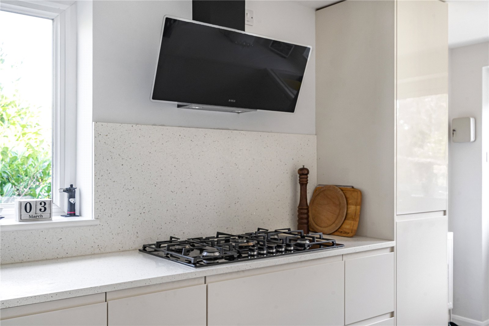 Kitchen : Attractive range of matching wall and base units with built-in dishwasher, fridge and freezer with AEG double oven and warming drawer. Excellent range of quartz work surfaces with 5 ring AEG gas hob and sink unit with hot tap. Outlook to garden with door to terrace and garden, laminate oak effect flooring, Elica cooker hood, space for wall television and dual aspect. Open through to: