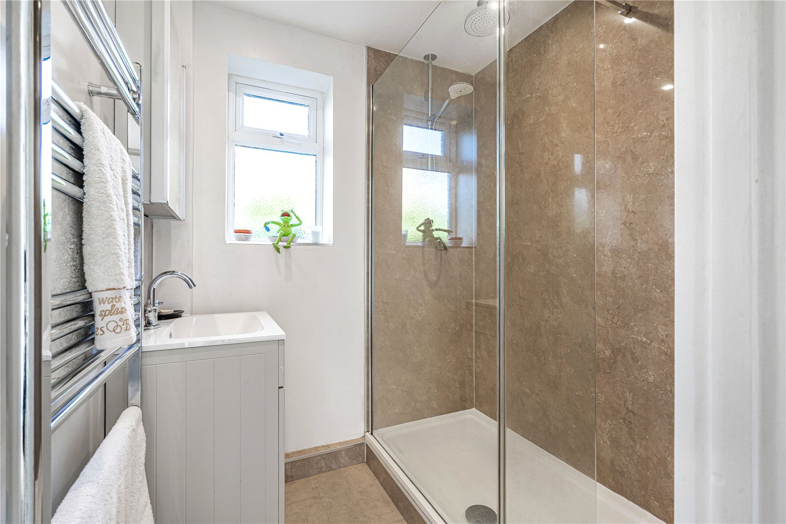Shower Room : Double walk in shower enclosure with screen, vanity unit with wash hand basin, chrome ladder radiator, down lights, tile effect flooring.