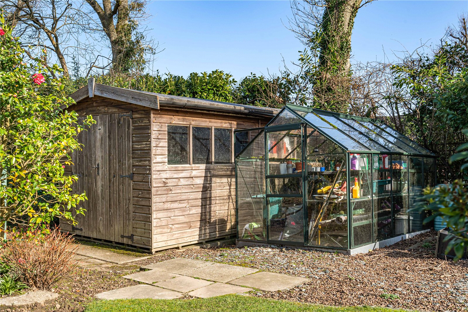 to a lower paved terrace. The garden is laid to lawn with shaped borders planted with a profusion of plants and specimen flowers with a rear area featuring a greenhouse and shed (with power). Bordering the greenhouse is a hard landscaped area. The whole is light and beautifully maintained.