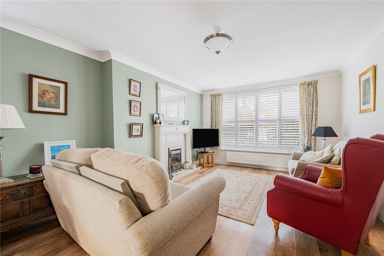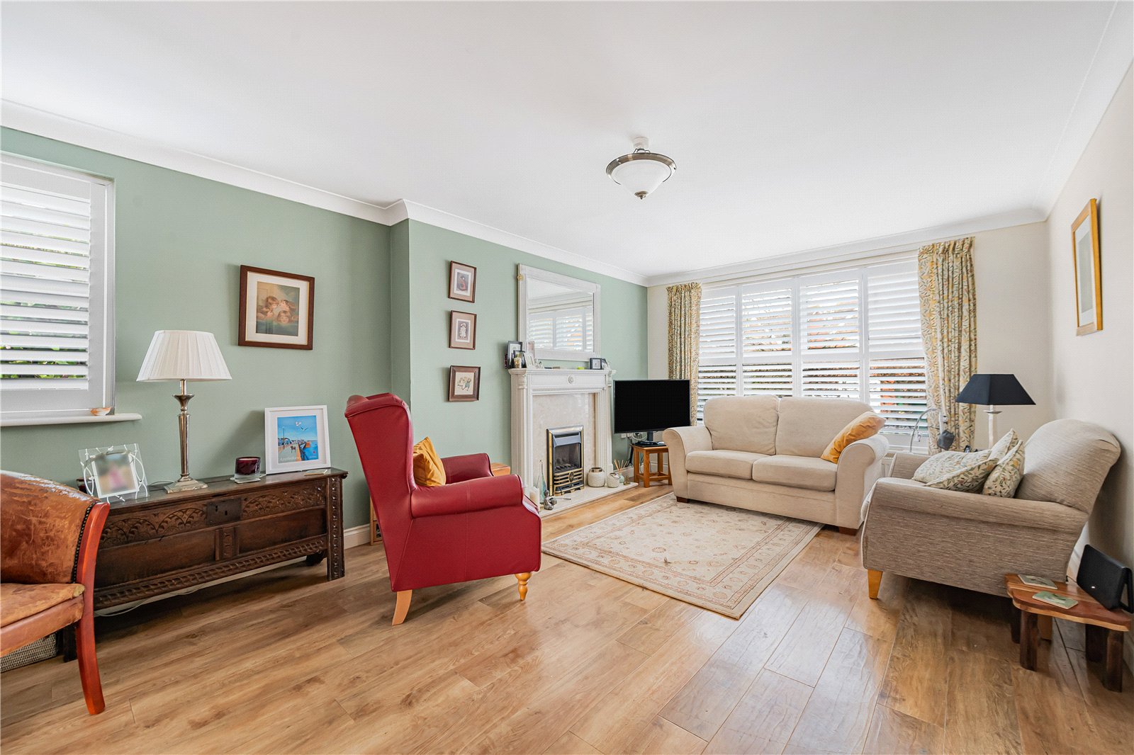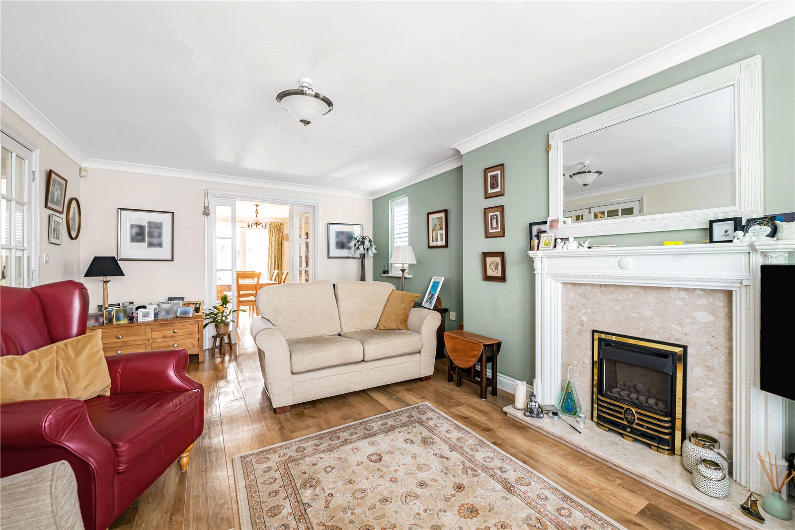 Sitting Room : Delightful formal reception room with dual aspect and featuring a coal effect fire with mantle and surround. Television and telephone points, radiator, Karndean oak laminate flooring, light point and double doors to Dining Room.