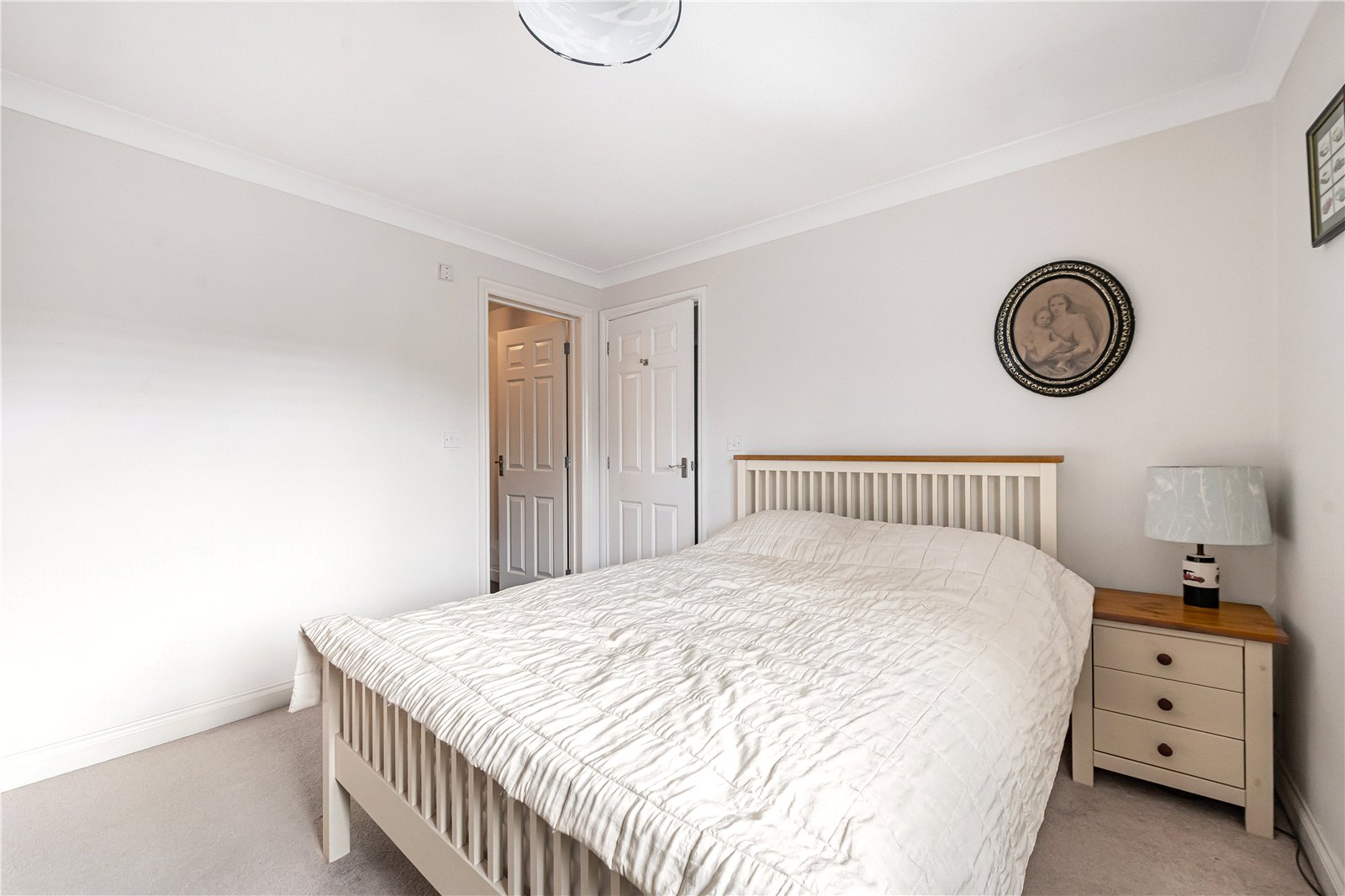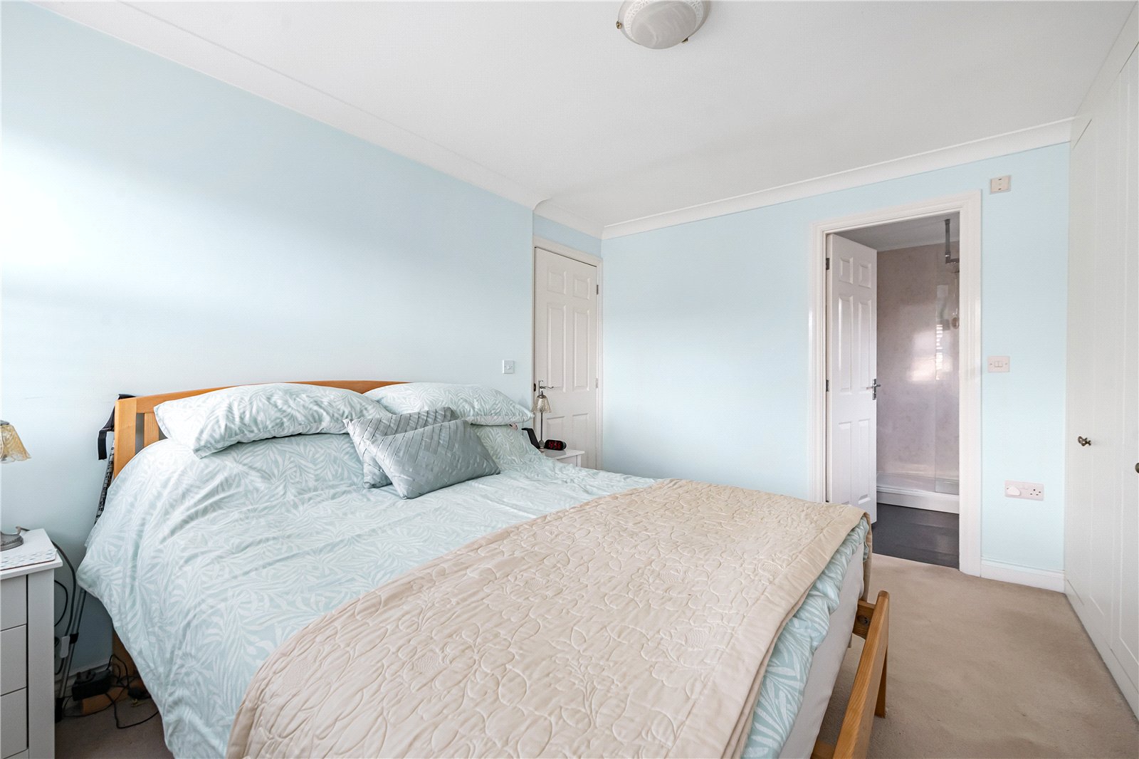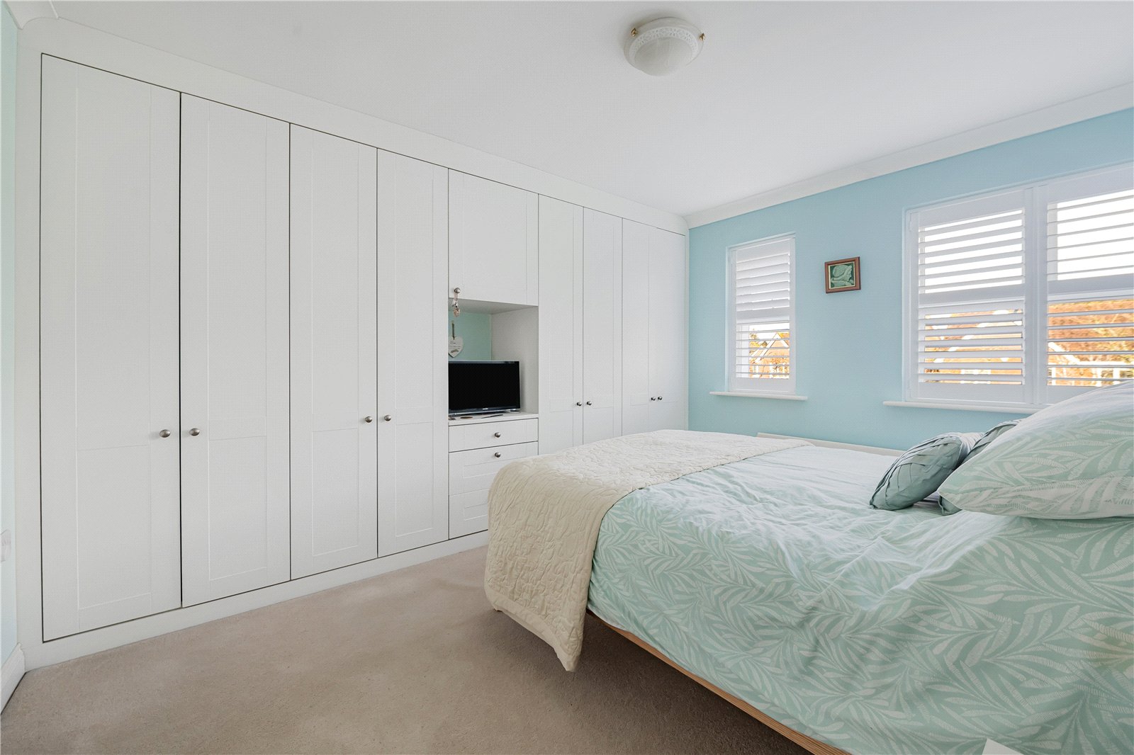 Bedroom 1 : Bright main bedroom with full width range of built-in double wardrobes (4 pairs) with drawers and display top. Radiator and light point. Door to: