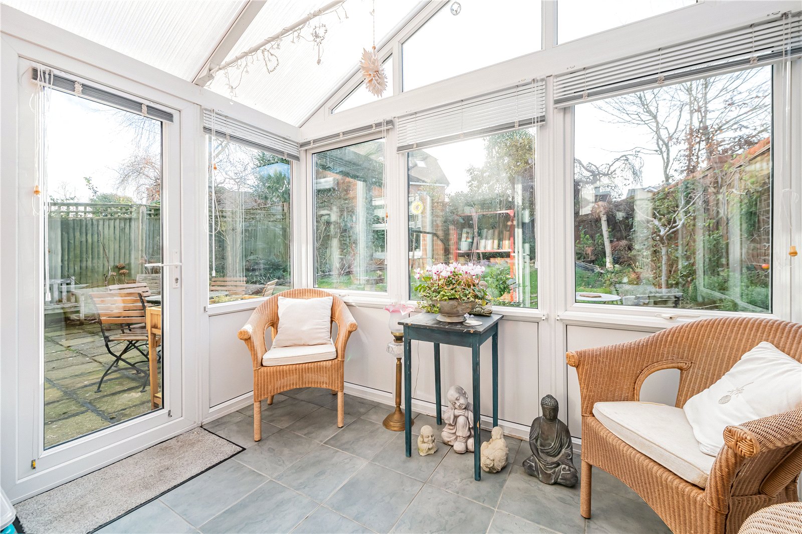 Conservatory : UPVC with pitched roof and door opening to terrace and garden. Tiled floor.