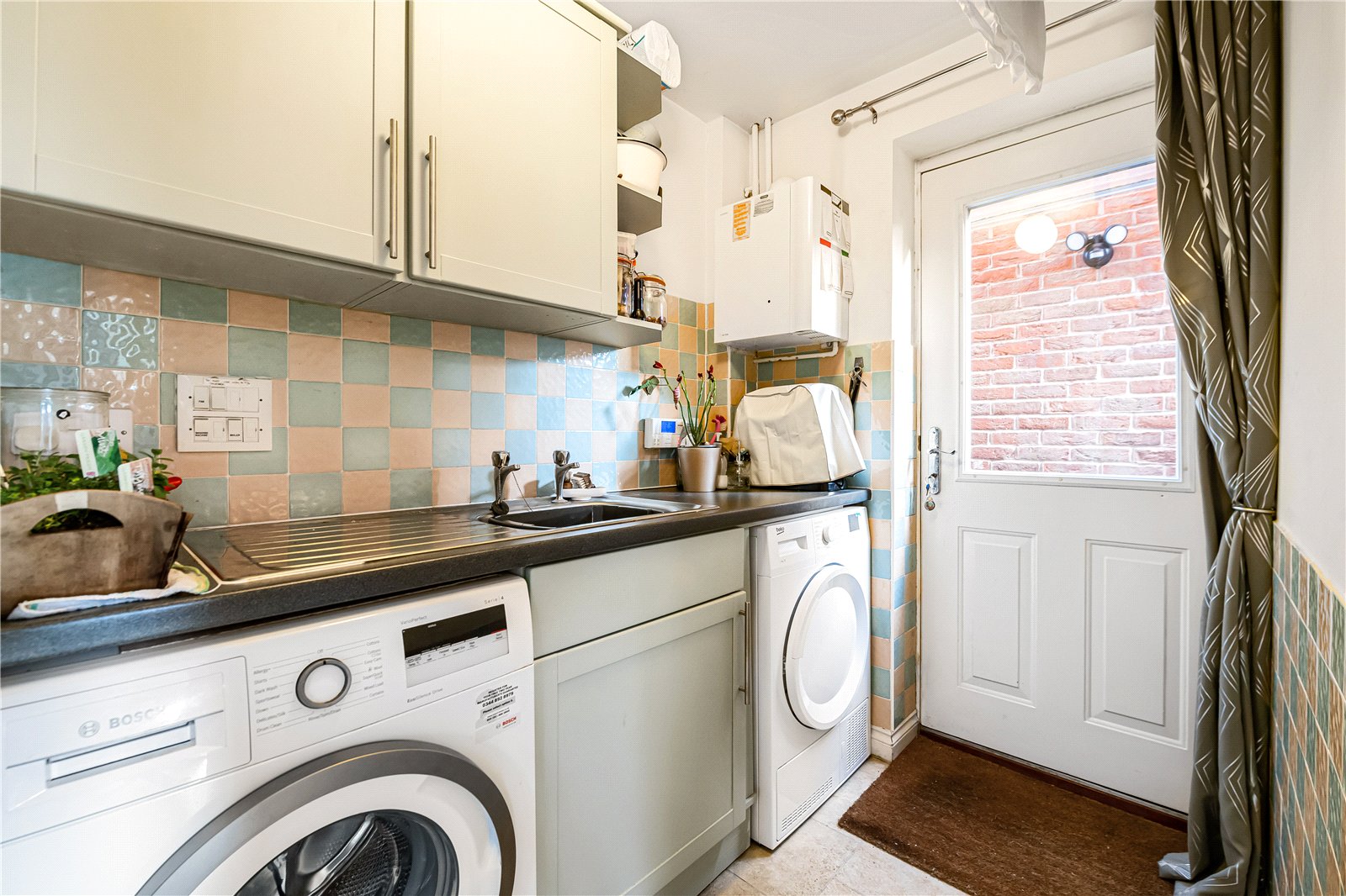 Utility Room : Useful area with base and wall units with space and plumbing for washing machine and dryer, range of work surface with sink, radiator, wall mounted gas fired boiler and tall broom cupboard. Door to outside.