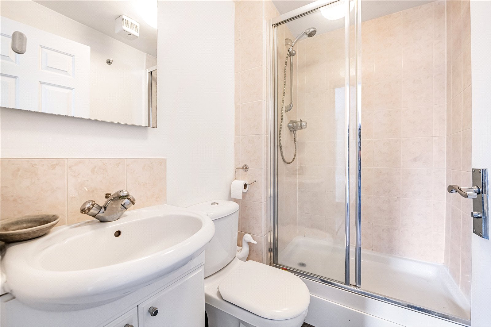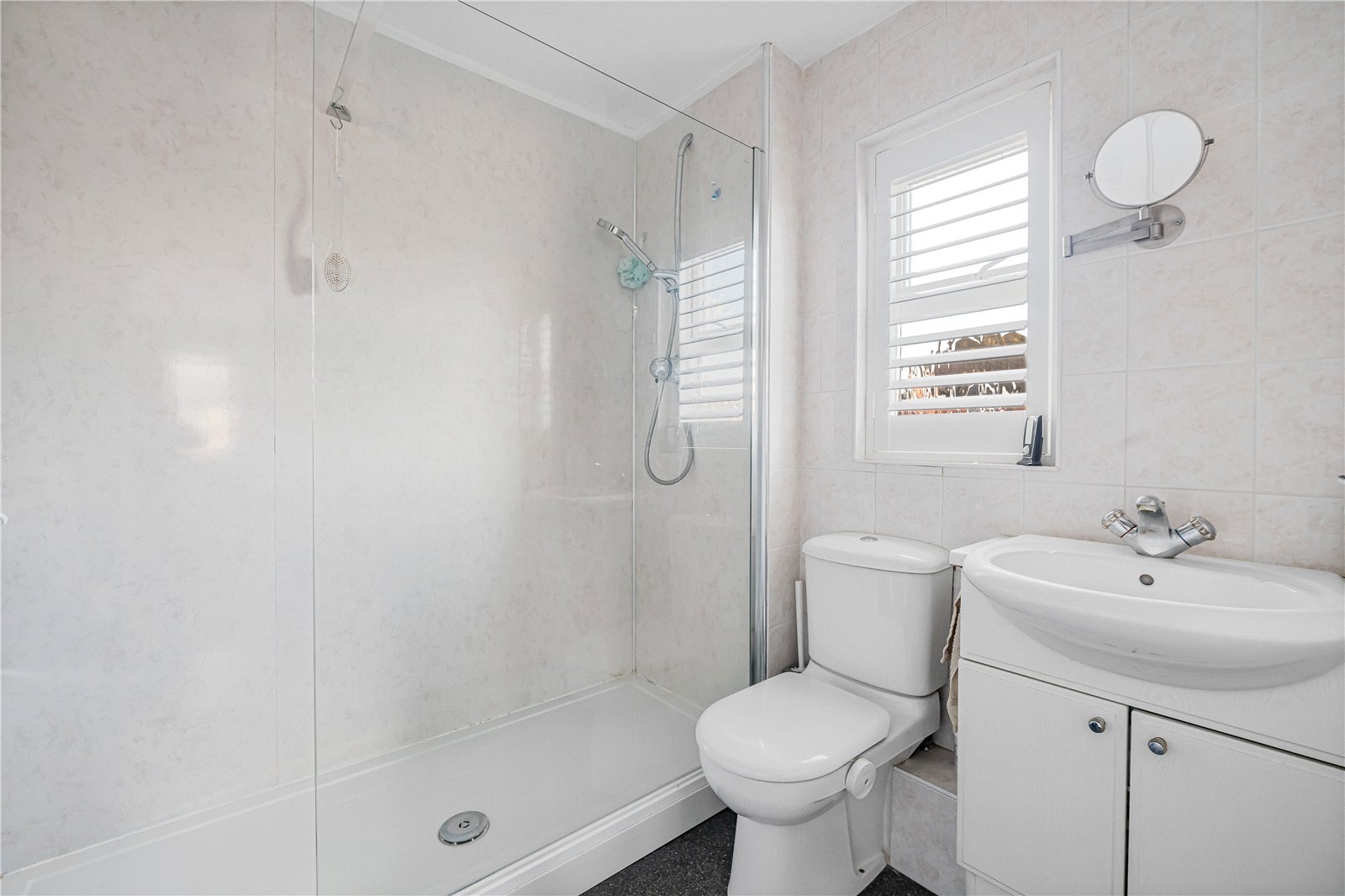 En-suite Shower Room : Double shower enclosure with vanity unit with wash hand basin and WC. Shaver point, chrome ladder radiator, tiled walls.