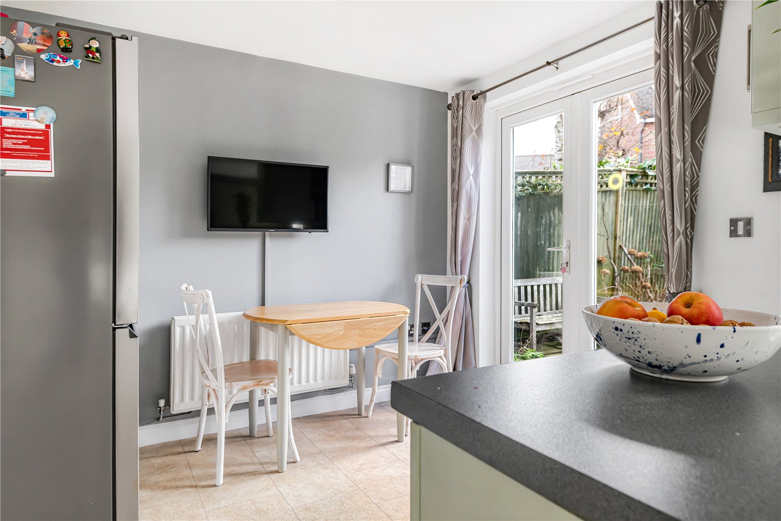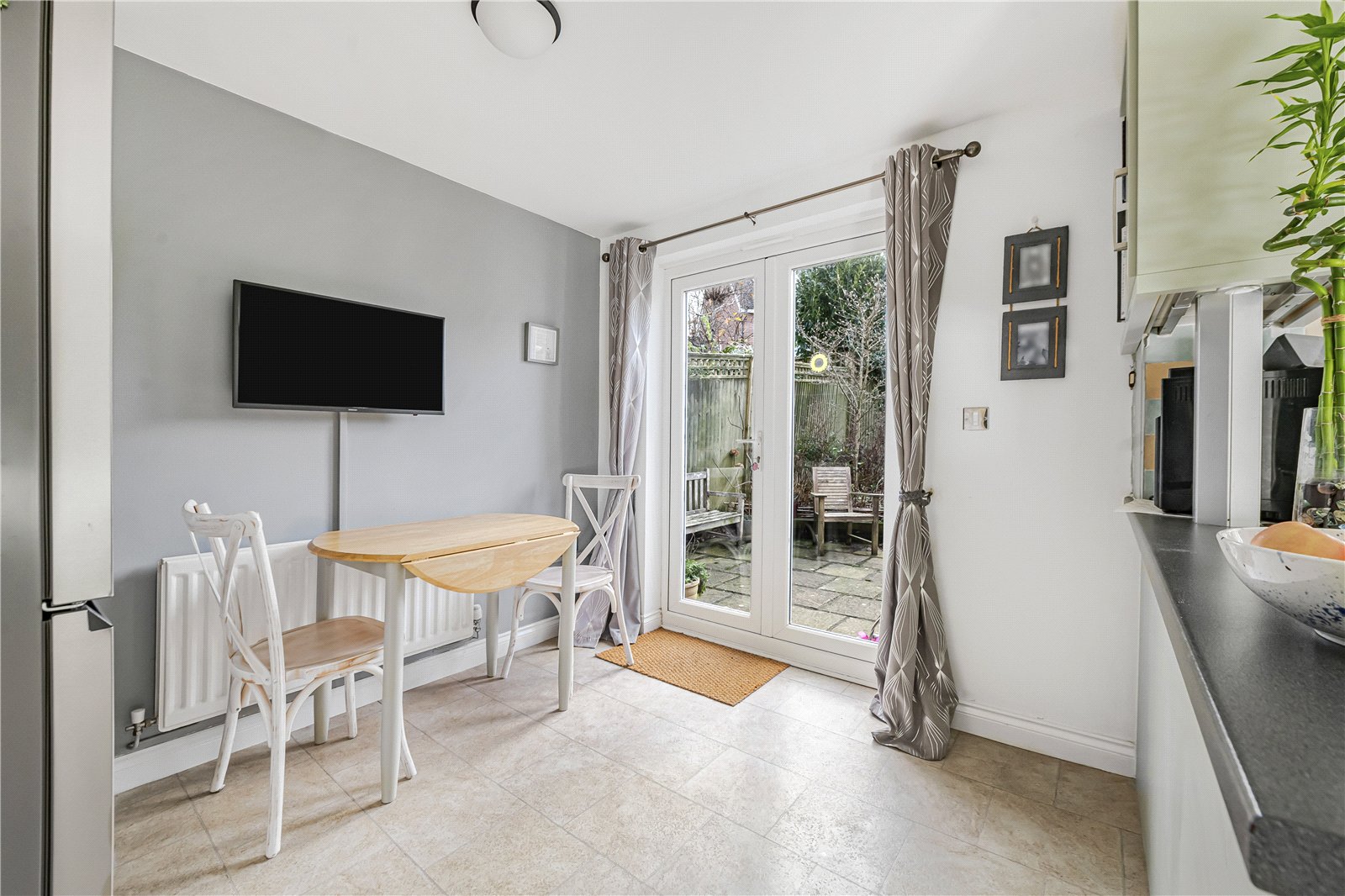 Breakfast Area : Space for table and chairs with door to outside, radiator and space for American style fridge freezer. Wall space for television with television point, light point and door to: