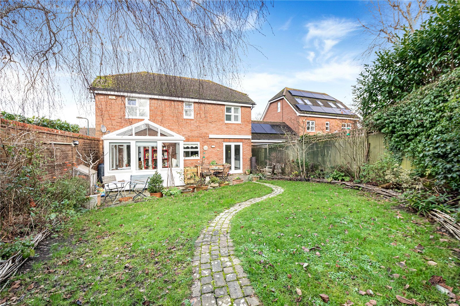 Nestling on a corner plot off this very popular development of village homes, this is a bright and spacious 5 bedroom house with well-planned family accommodation. Internally there are 2 reception rooms with a conservatory, a superb kitchen with breakfast room and utility and 5 bedrooms and 3 bathrooms. The garden is landscaped and enclosed on a lovely corner plot with parking and garage. The house is conveniently located on the edge of the town close to the leisure centre with the centre and Waitrose approx. 20 minute walk (0.8mile) away.